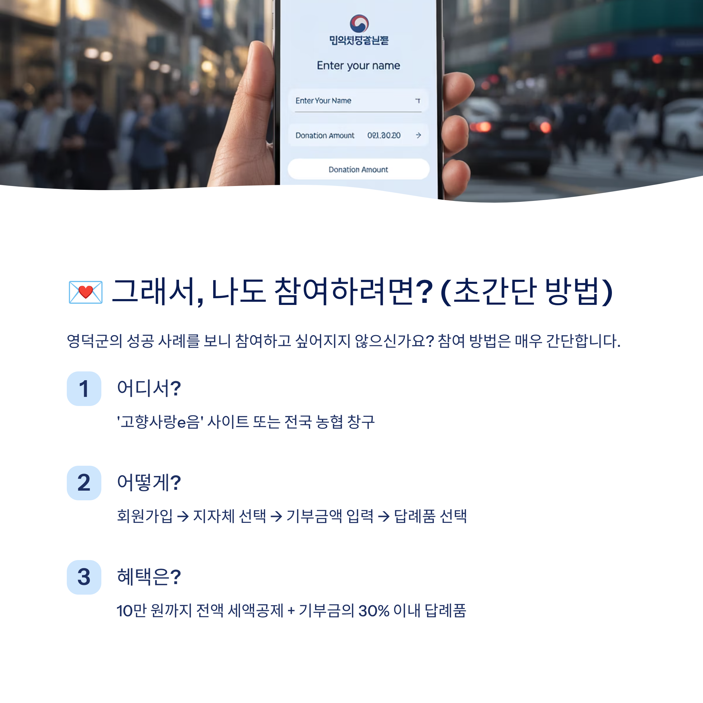 영덕군의 성공 사례를 보니, 고향사랑기부제에 참여하고 싶어지지 않으신가요? 참여 방법은 매우 간단합니다.