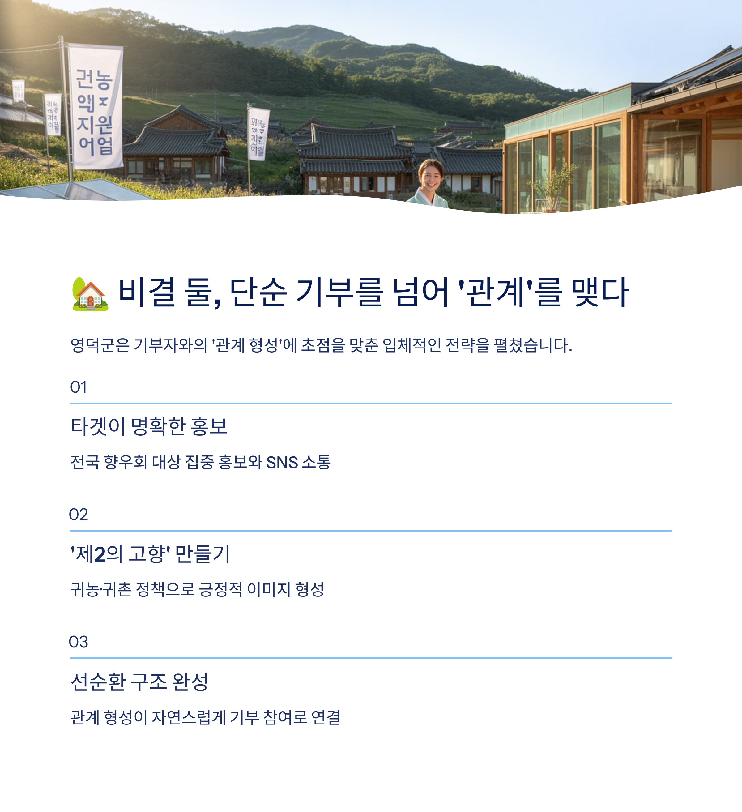 하지만 단순히 답례품만 좋았던 것은 아닙니다. 영덕군은 기부자와의 '관계 형성'에 초점을 맞춘 입체적인 전략을 펼쳤습니다.