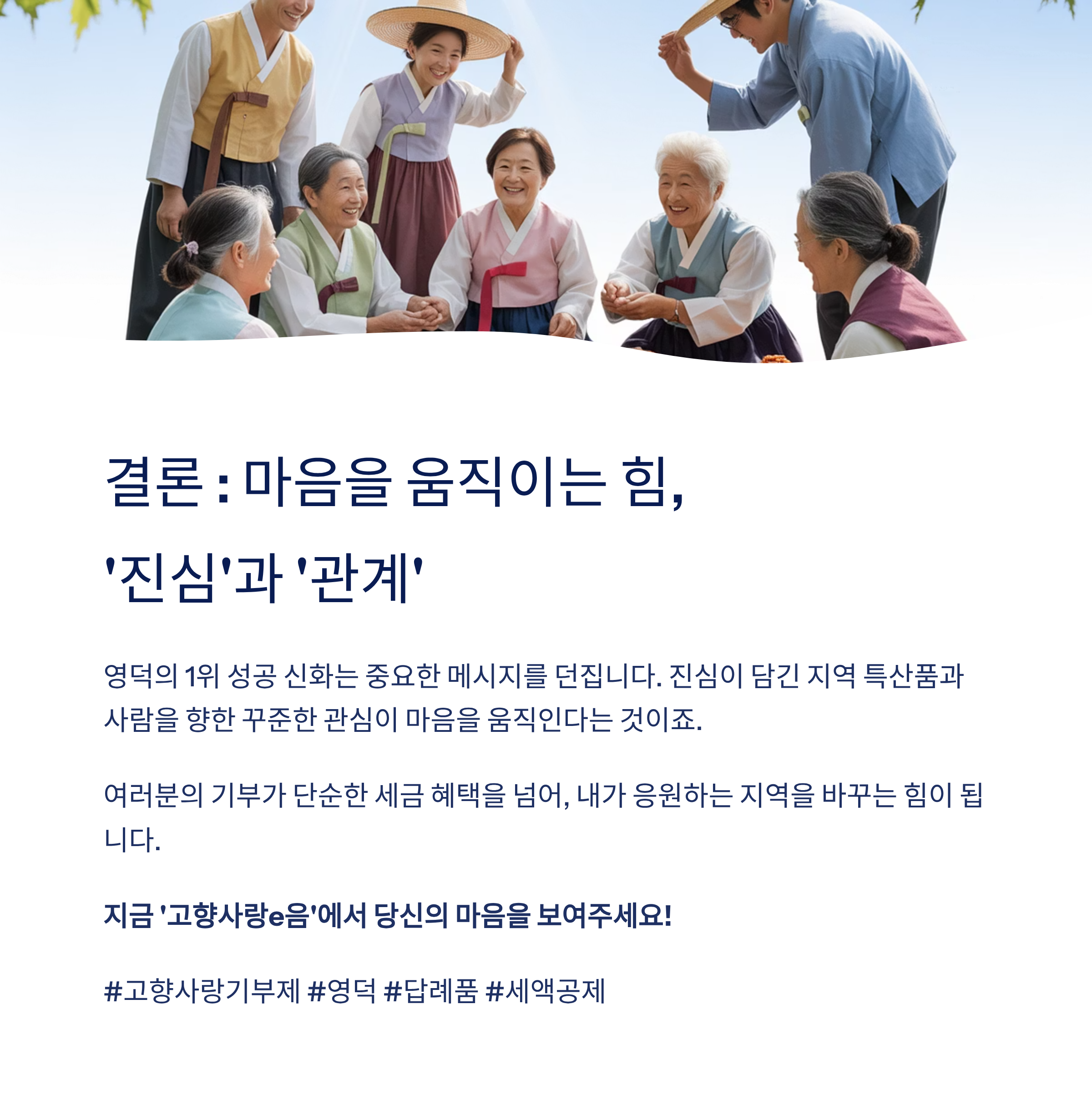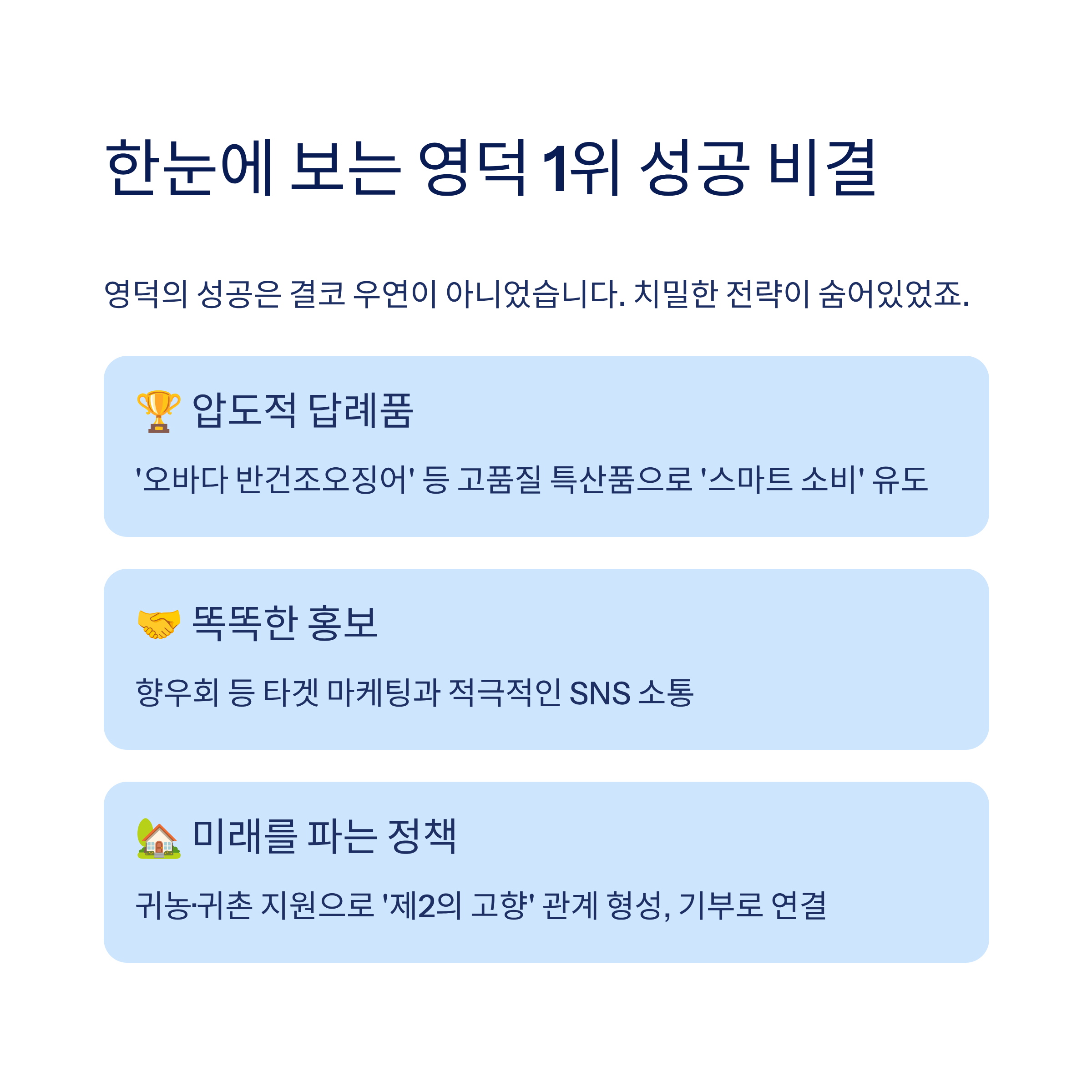 영덕군의 1위 비결은 단순히 좋은 특산품에만 있지 않았습니다. **매력적인 답례품(반건조 오징어, 대게)을 통한 '스마트한 소비' 제안, 적극적인 홍보를 통한 '소통', 그리고 귀농·귀촌 정책을 통한 '미래 관계 형성'**이라는 3박자가 완벽하게 어우러진 결과였습니다.