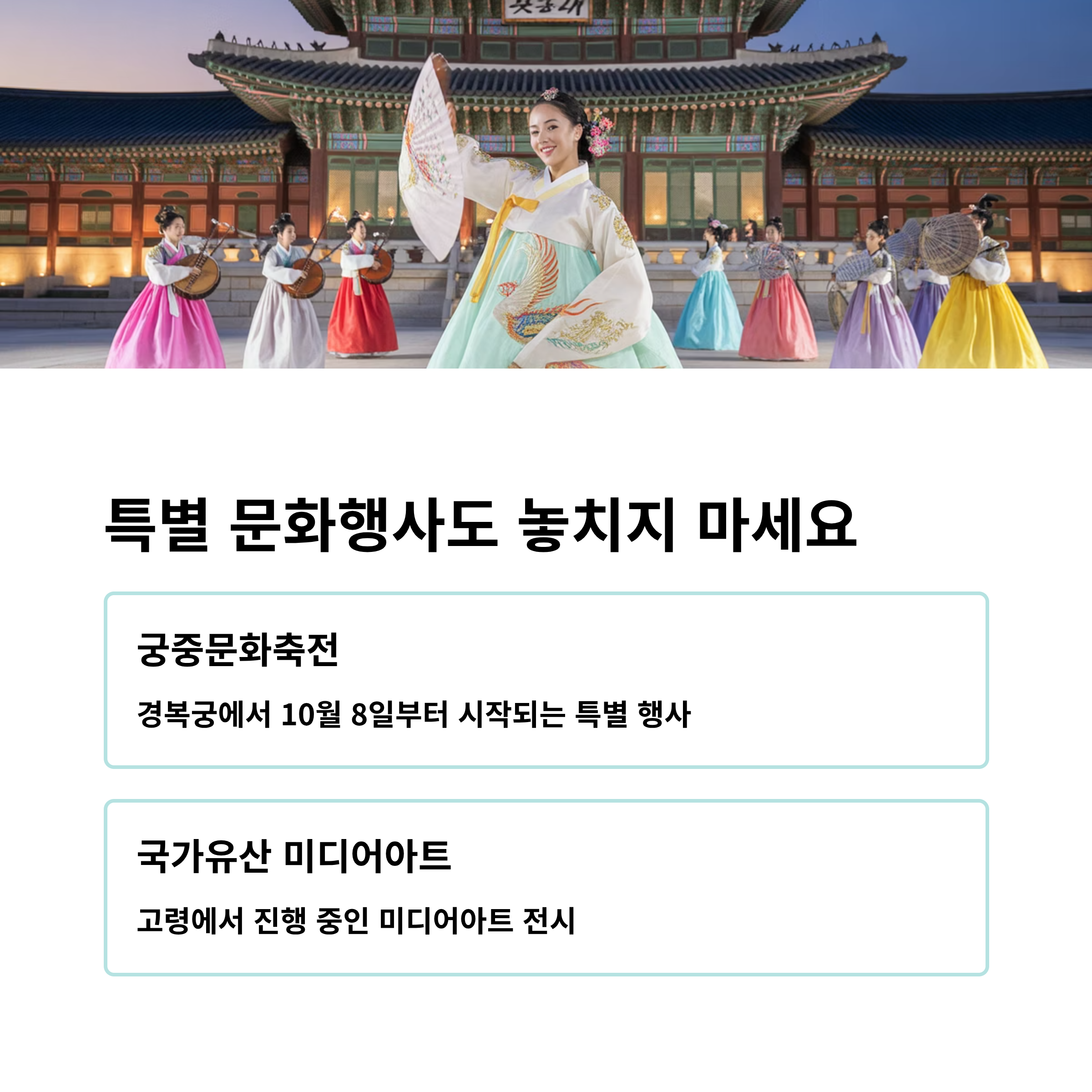 이 외에도 '궁중문화축전'(경복궁, 10/8~), '국가유산 미디어아트'(고령, 진행 중) 등 다양한 행사가 열리니 이번 기회에 꼭 방문해 보세요!