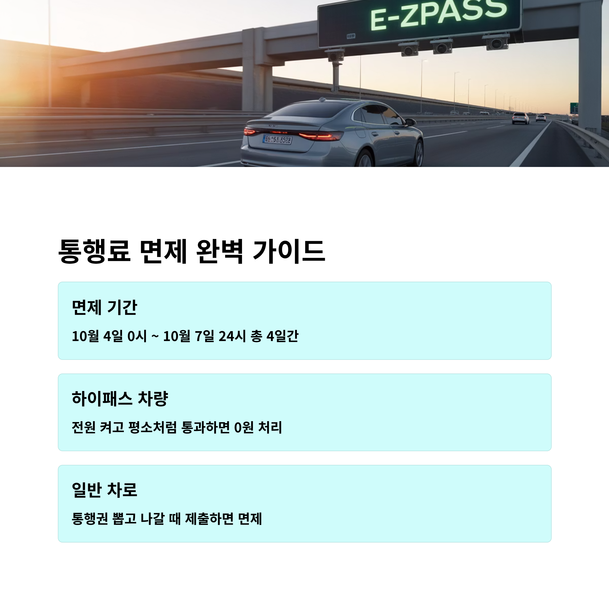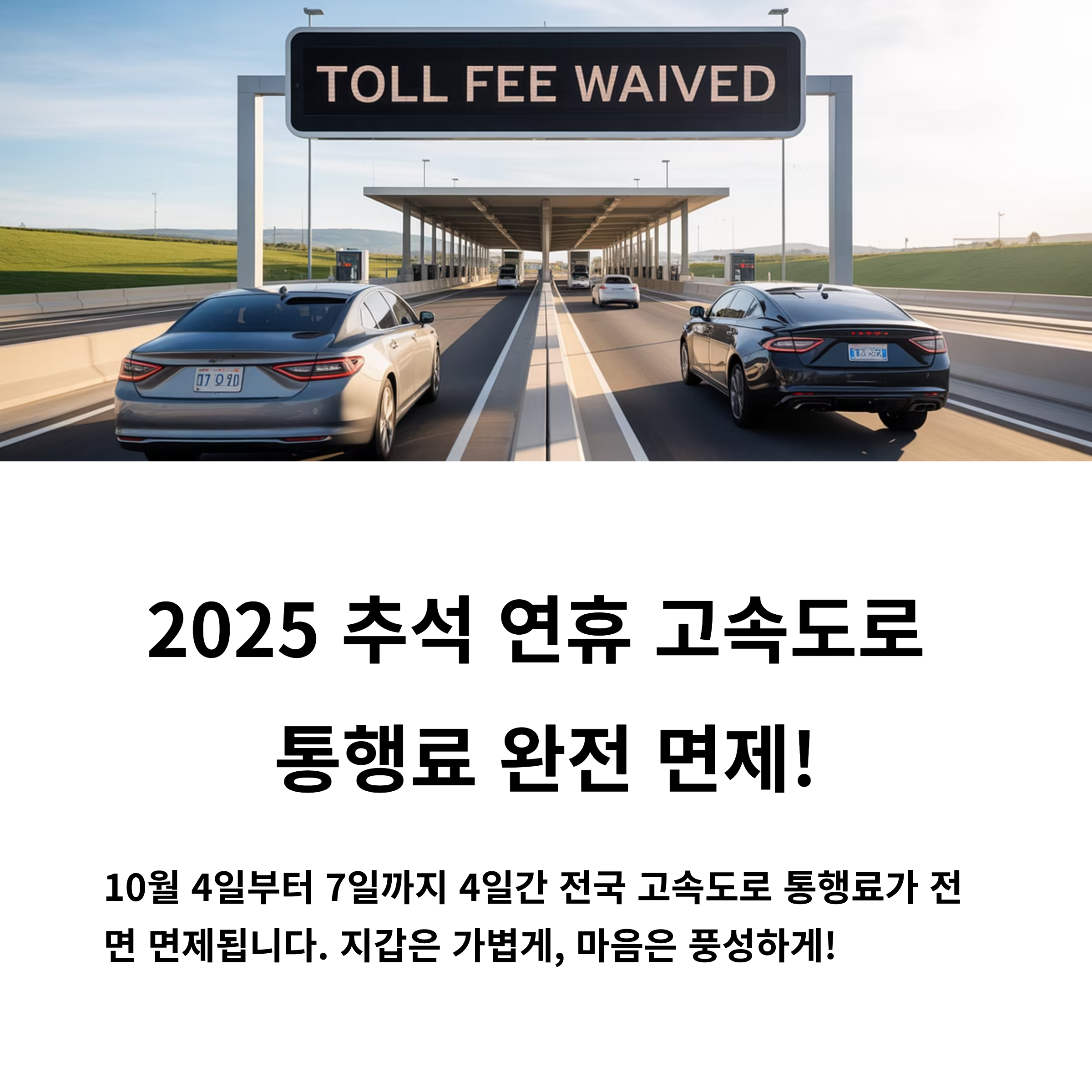 💸 고속도로 통행료 면제 | 기간: 10월 4일(토) 00시 ~ 10월 7일(화) 24시 방법: 하이패스 전원 ON 상태로 그냥 통과! |