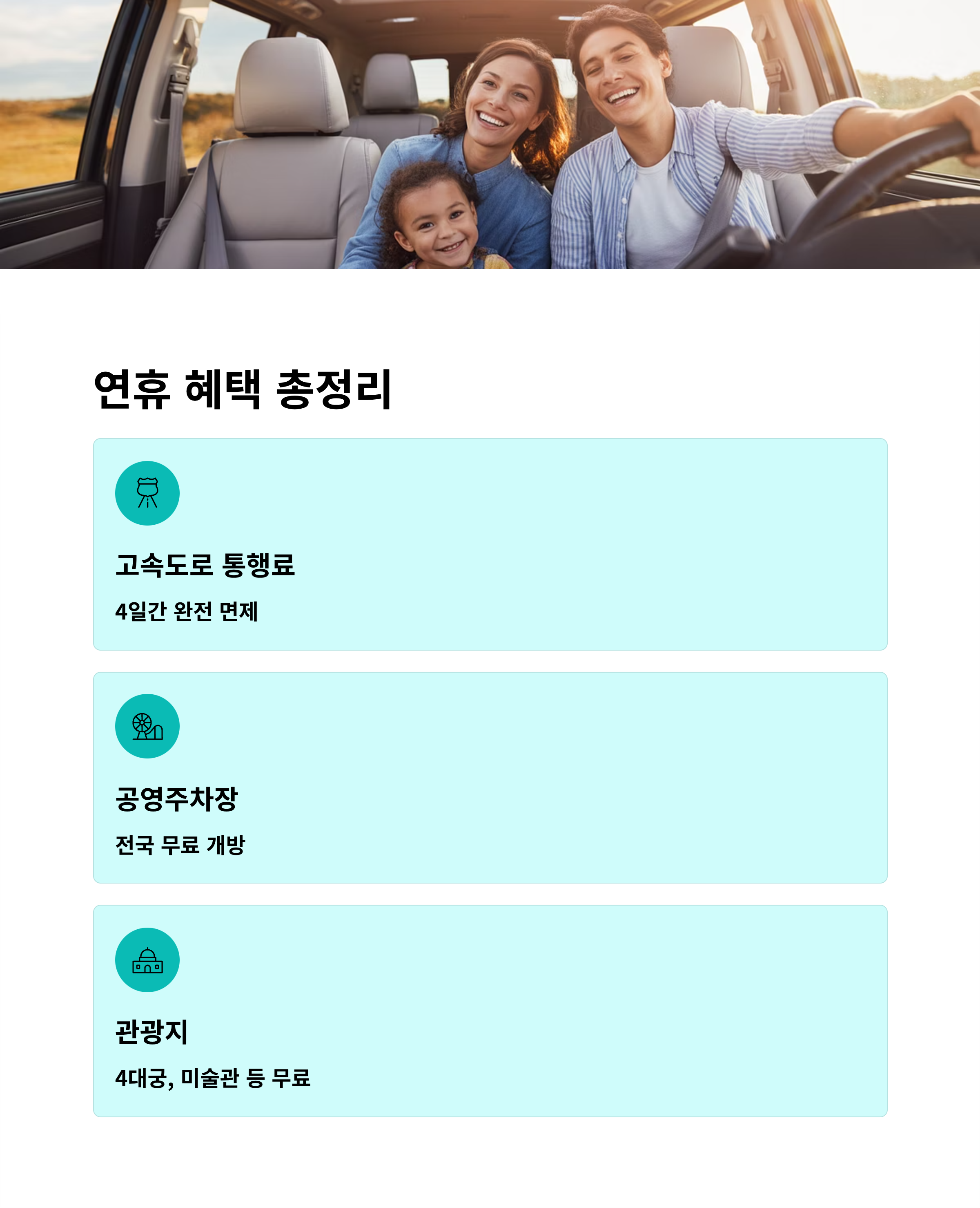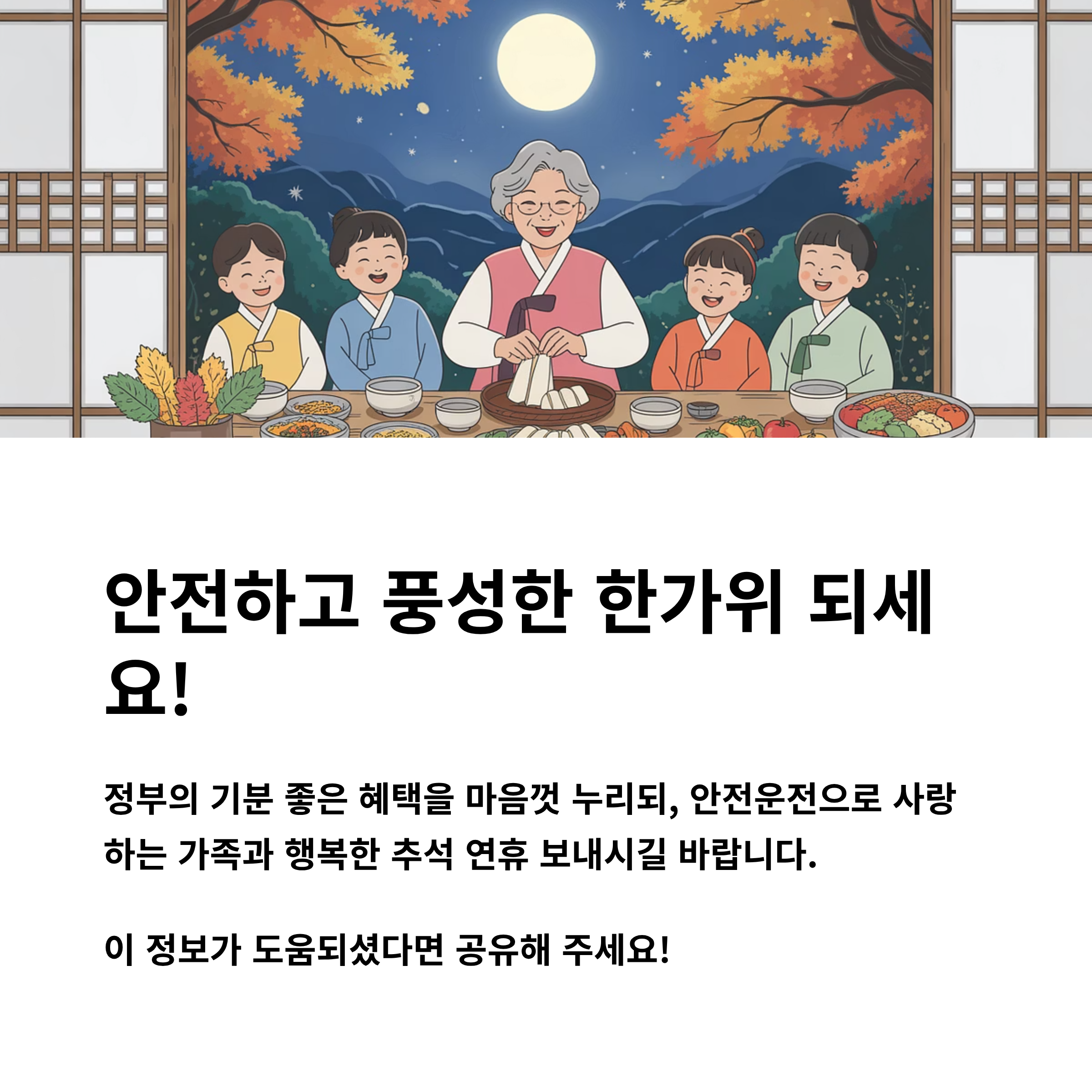 통행료와 주차비 걱정 없이 떠날 수 있는 풍성한 한가위! 정부가 마련한 다양한 혜택을 마음껏 누리시되, 가장 중요한 것은 '안전'이라는 사실은 절대 잊지 마세요.