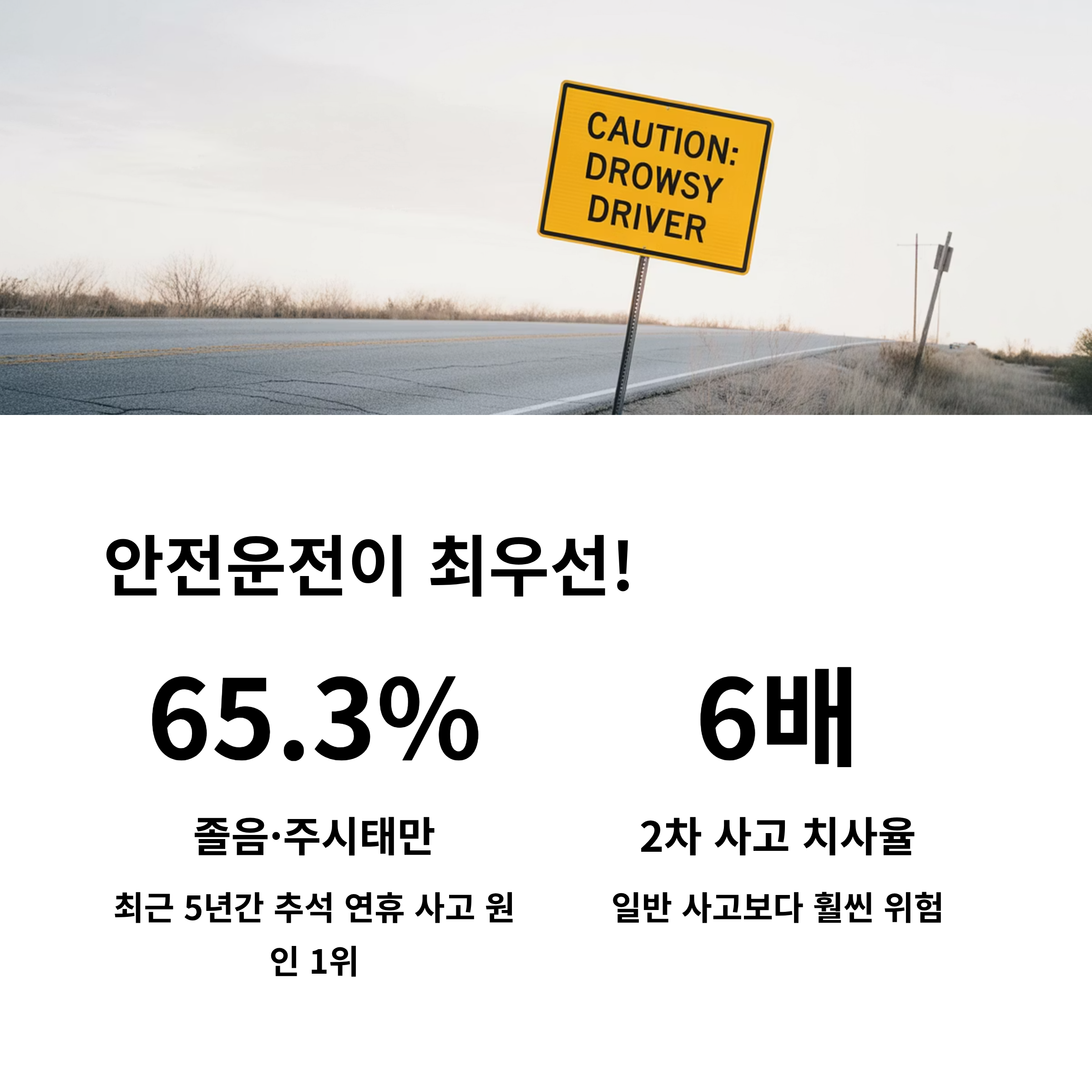 즐거운 귀성길, 안전이 최우선입니다. 한국도로공사에 따르면 최근 5년간 추석 연휴 사고 원인 1위는 바로 졸음 및 주시태만(65.3%)이었습니다.