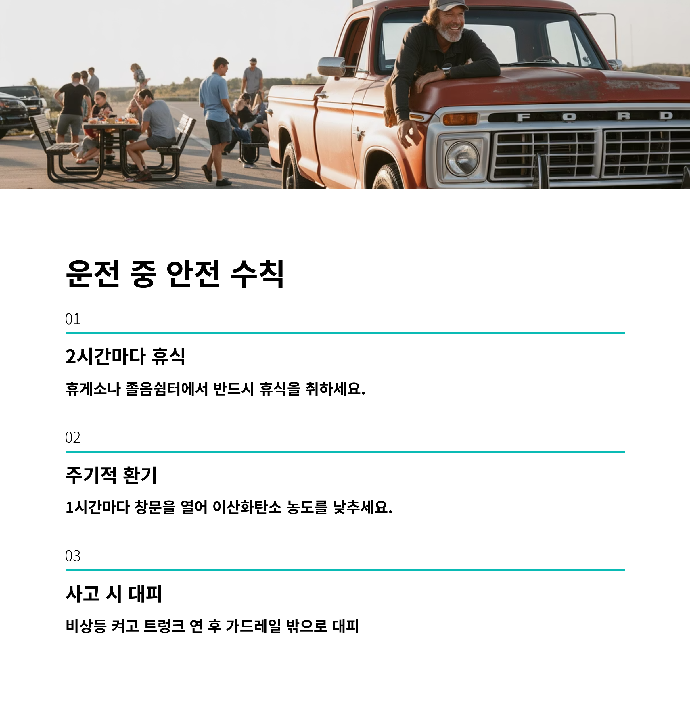 - ✅ 2시간마다 휴게소/졸음쉼터에서 휴식! 피로가 느껴지기 전에 미리 쉬어가는 것이 최고의 예방법입니다.