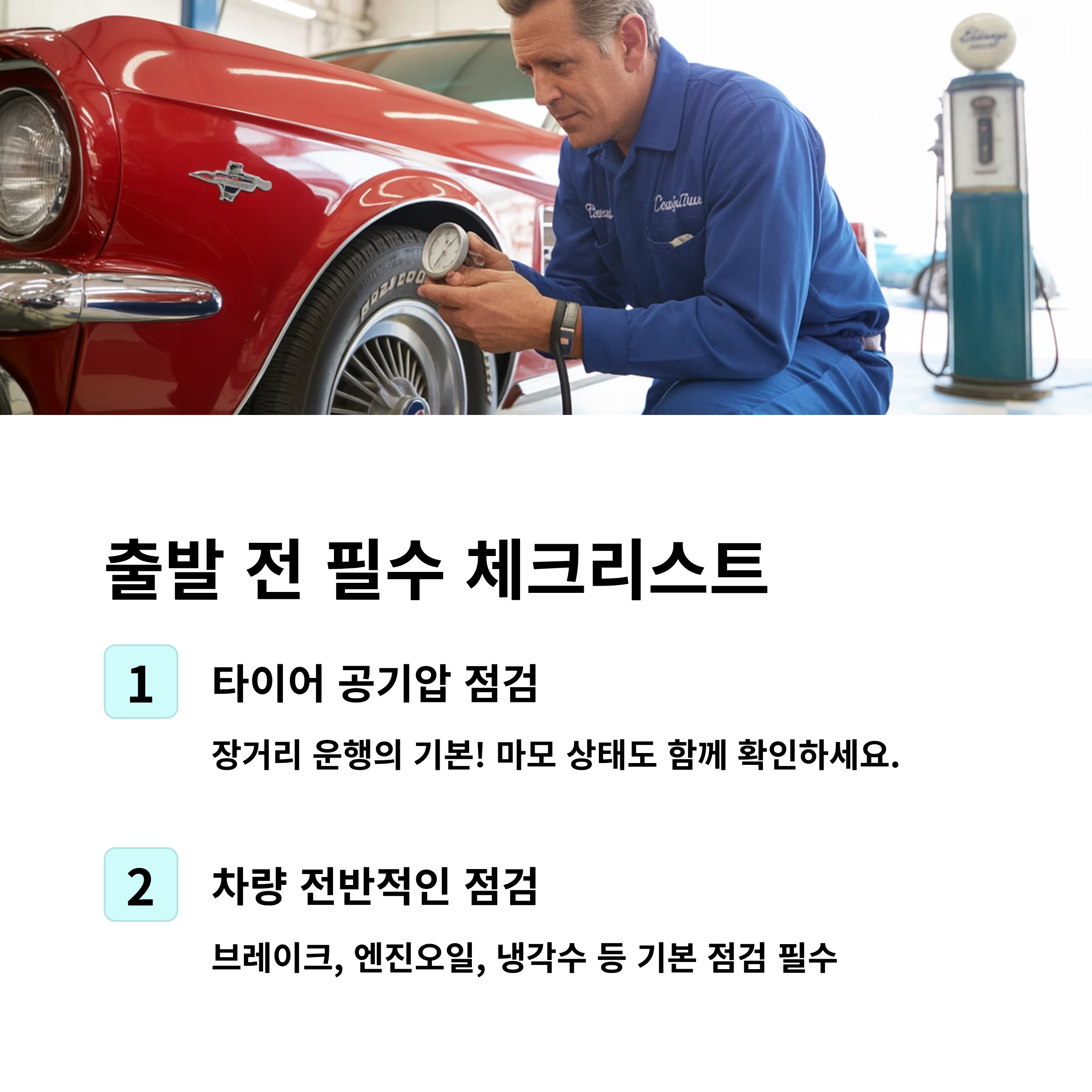 - ✅ 출발 전 타이어 공기압 체크! 장거리 운행의 기본! 타이어 공기압과 마모 상태를 반드시 점검해 주세요.