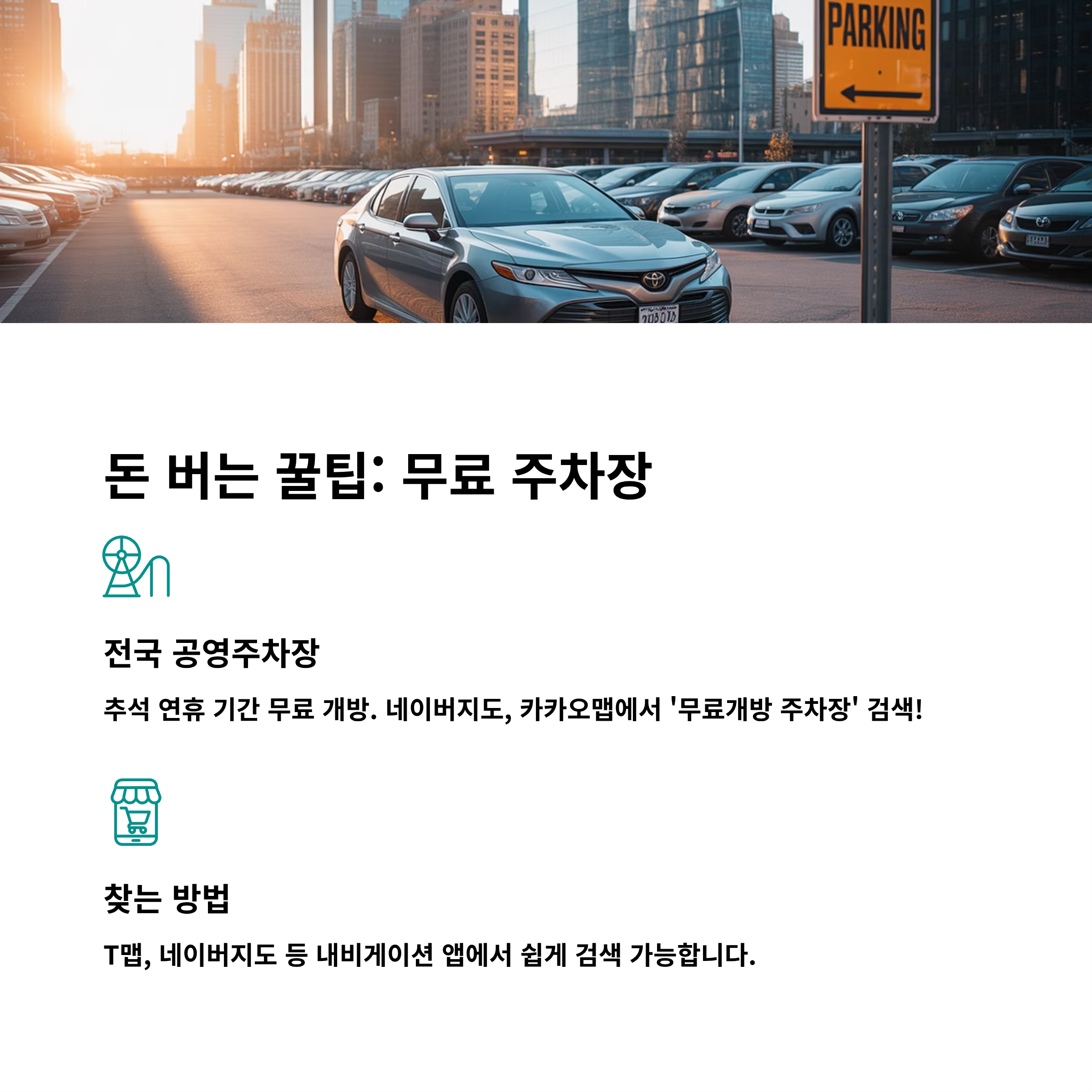 🚗 전국 공영주차장 무료 | 기간: 추석 연휴 기간 (지자체별 상이) 찾는 법: 네이버지도, 카카오맵, T맵 등에서 '무료개방 주차장' 검색 |