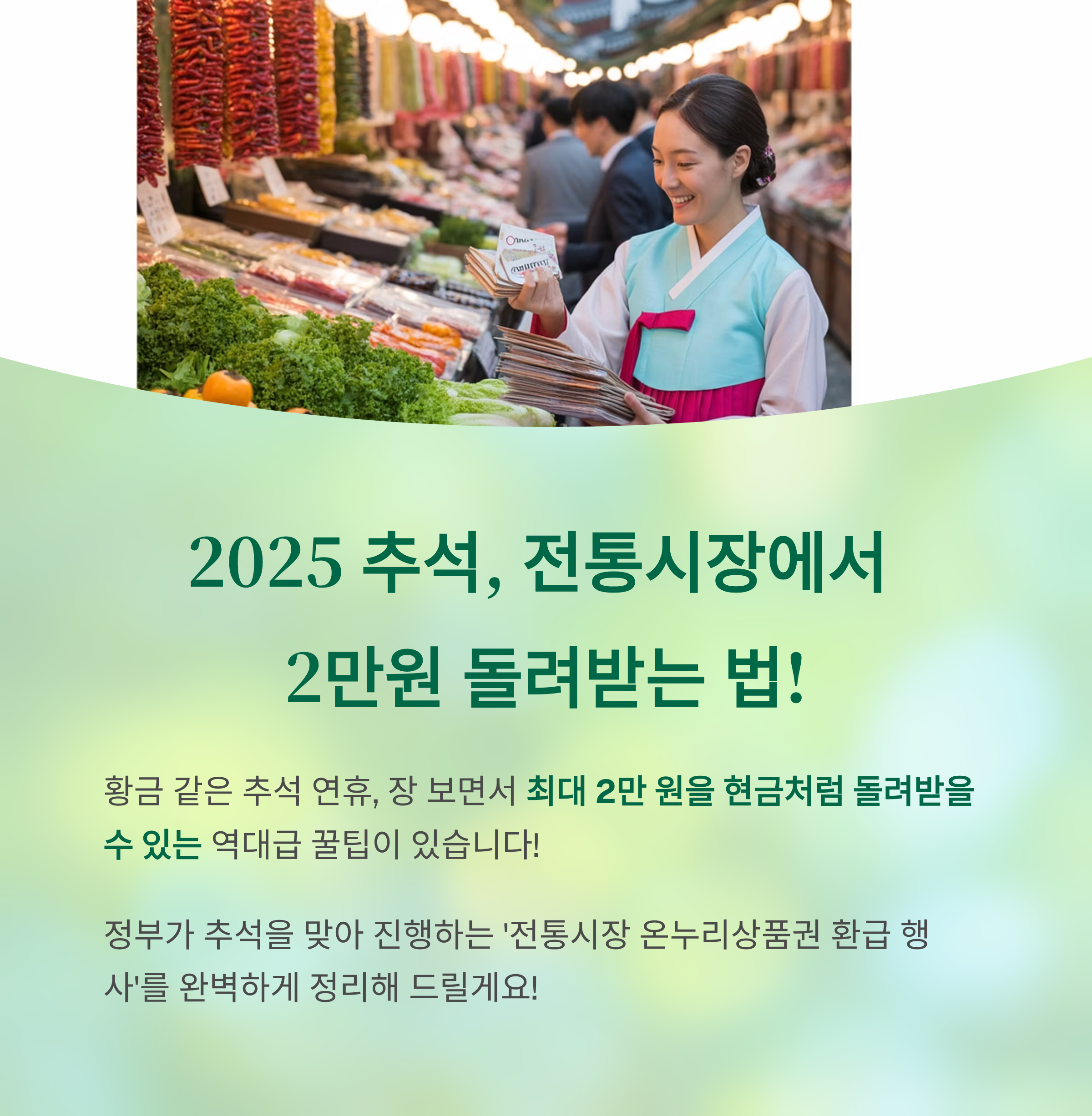 하지만 바로 오늘, 장 보면서 최대 2만 원을 현금처럼 돌려받을 수 있는 역대급 꿀팁이 있습니다! 바로 정부가 추석을 맞아 진행하는 '전통시장 온누리상품권 환급 행사'입니다. 그냥 지나치면 나만 손해! 어떻게 하면 2만 원을 돌려받을 수 있는지, 기간과 방법, 주의사항까지 평오니가 완벽하게 정리해 드릴게요!