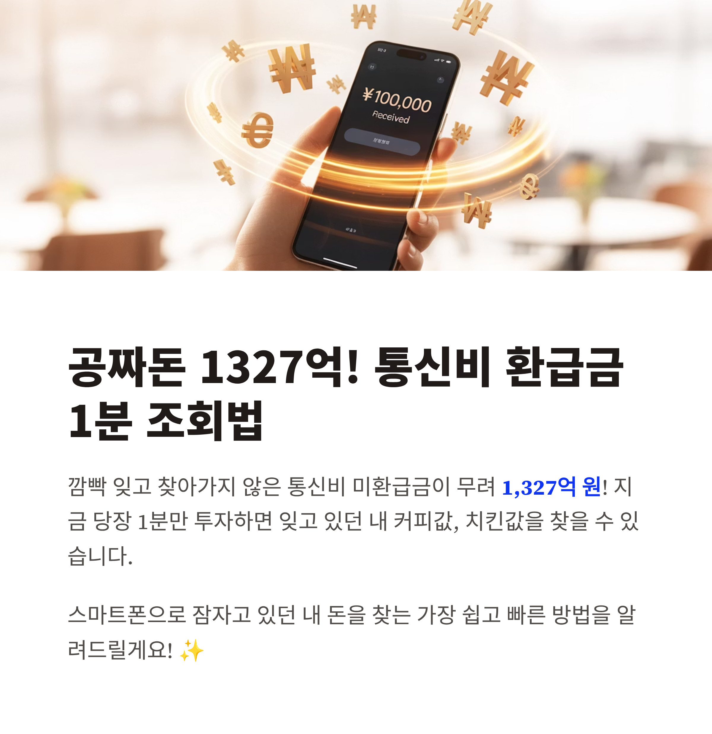 "혹시 이 1,327억 원 중에 내 돈도?" 😱 깜빡하고, 혹은 몰라서 찾아가지 않은 통신비 미환급금이 무려 1,327억 원에 달한다는 사실, 알고 계셨나요? 단 1분만 투자하면 커피값부터 치킨값까지 숨어있던 내 공돈을 찾을 수 있습니다. 지금부터 스마트폰 하나로 통신비 환급금을 조회하고 신청하는 초간단 방법을 모두 알려드릴게요! ✨