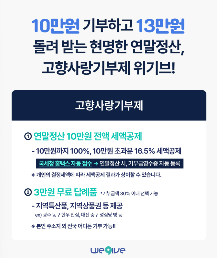 - 기부 금액은 10만원 이상부터 가능! (답례품 가격 때문!)