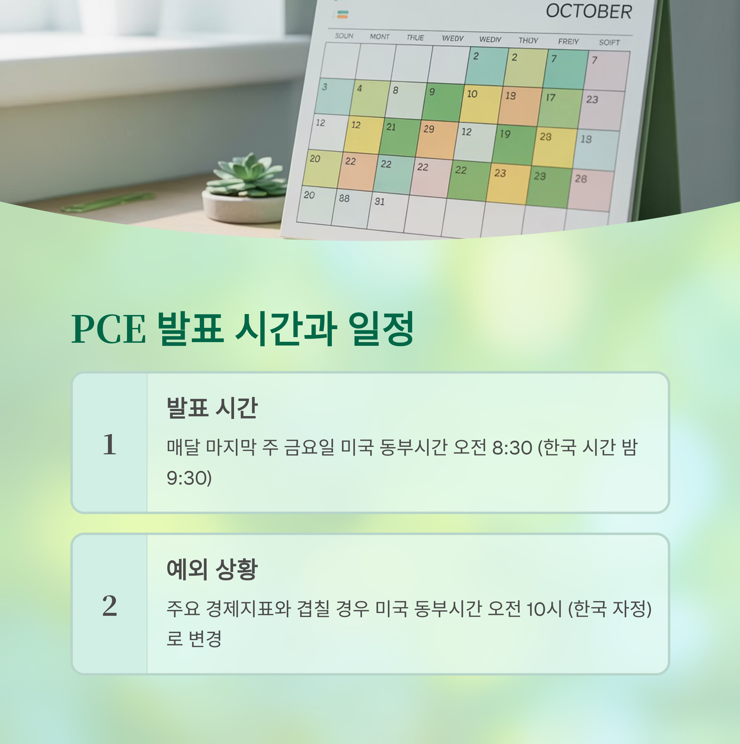 A2. 주로 미국 동부 시간으로 매월 마지막 주 금요일 오전 8시 30분이며, 한국 시각으로는 밤 9시 30분에 발표됩니다. 다만 다른 지표와 겹치면 오전 10시(한국 자정)에 발표될 수 있습니다.