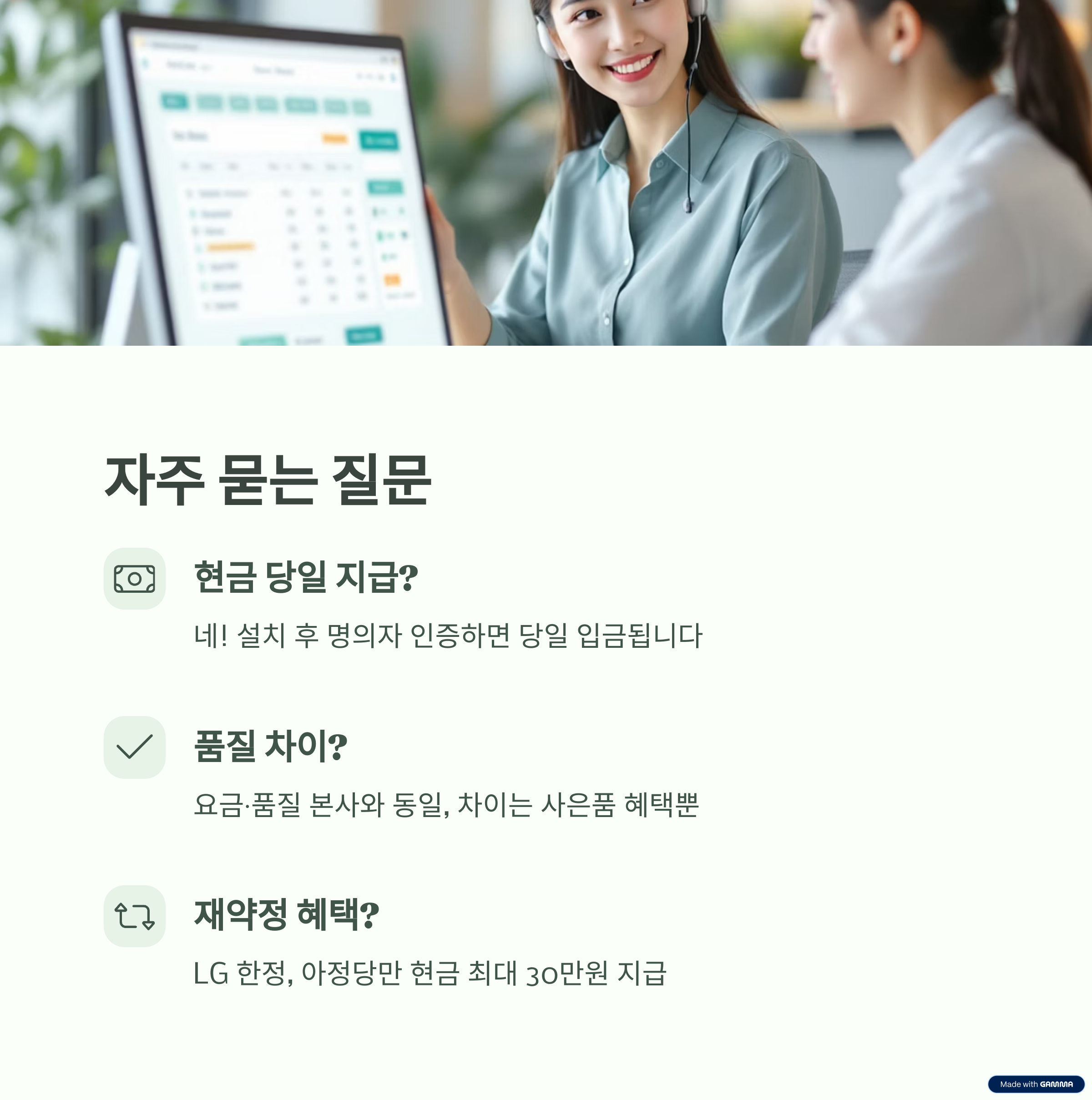- 기사 방문/설치: 평균 1~3일 내, 설치 후 현금 사은품 당일 지급