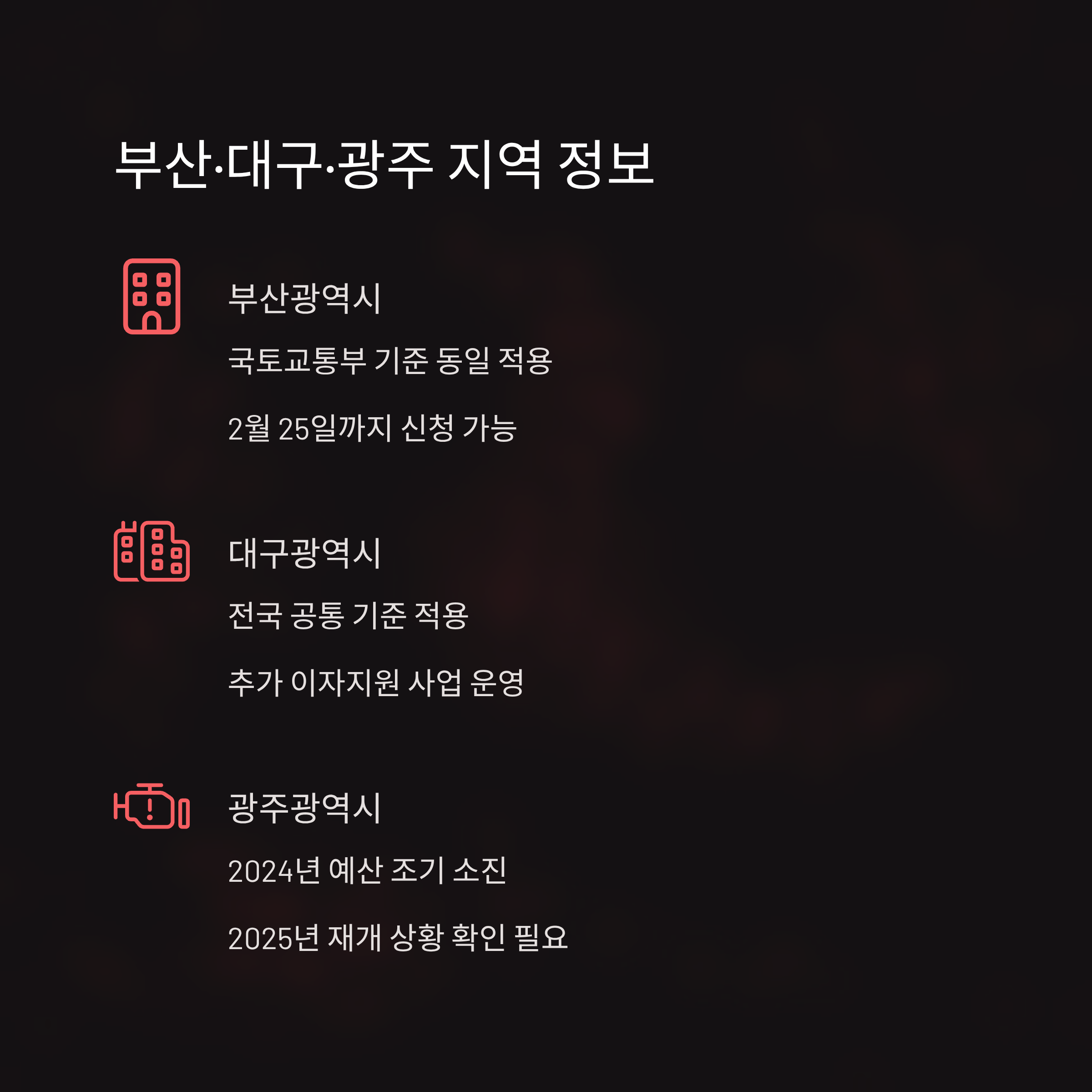 부산, 대구, 광주는 현재 국토교통부의 ‘청년월세 한시 특별지원’ 사업을 동일하게 진행하고 있습니다. 신청 기간과 조건, 금액 모두 전국 공통 기준을 따르니 위 내용을 참고하여 2025년 2월 25일까지 꼭 신청하세요!