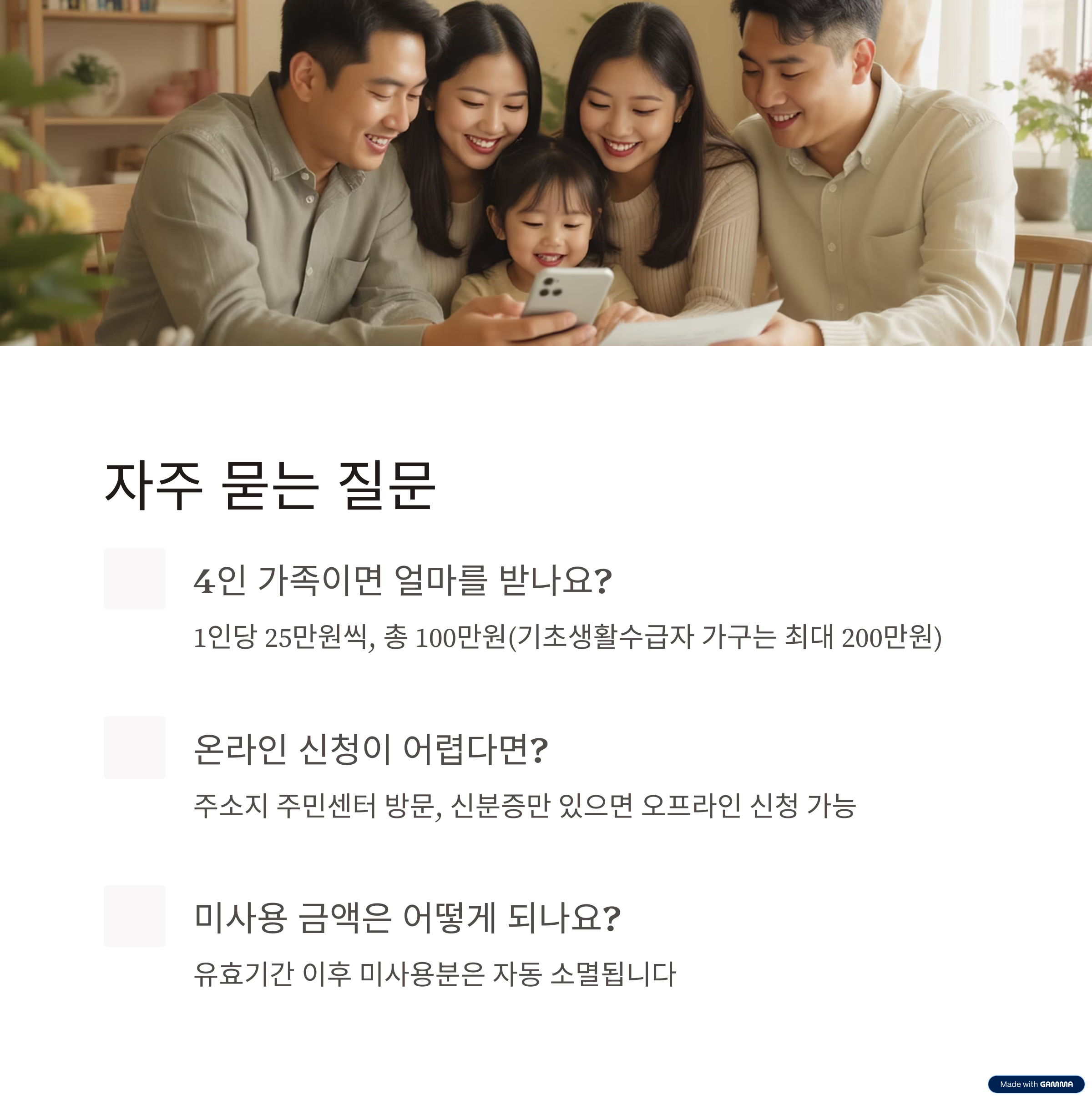 A. 1인당 25만원씩, 총 100만원(기초생활수급자 가구는 최대 200만원) 지급됩니다.