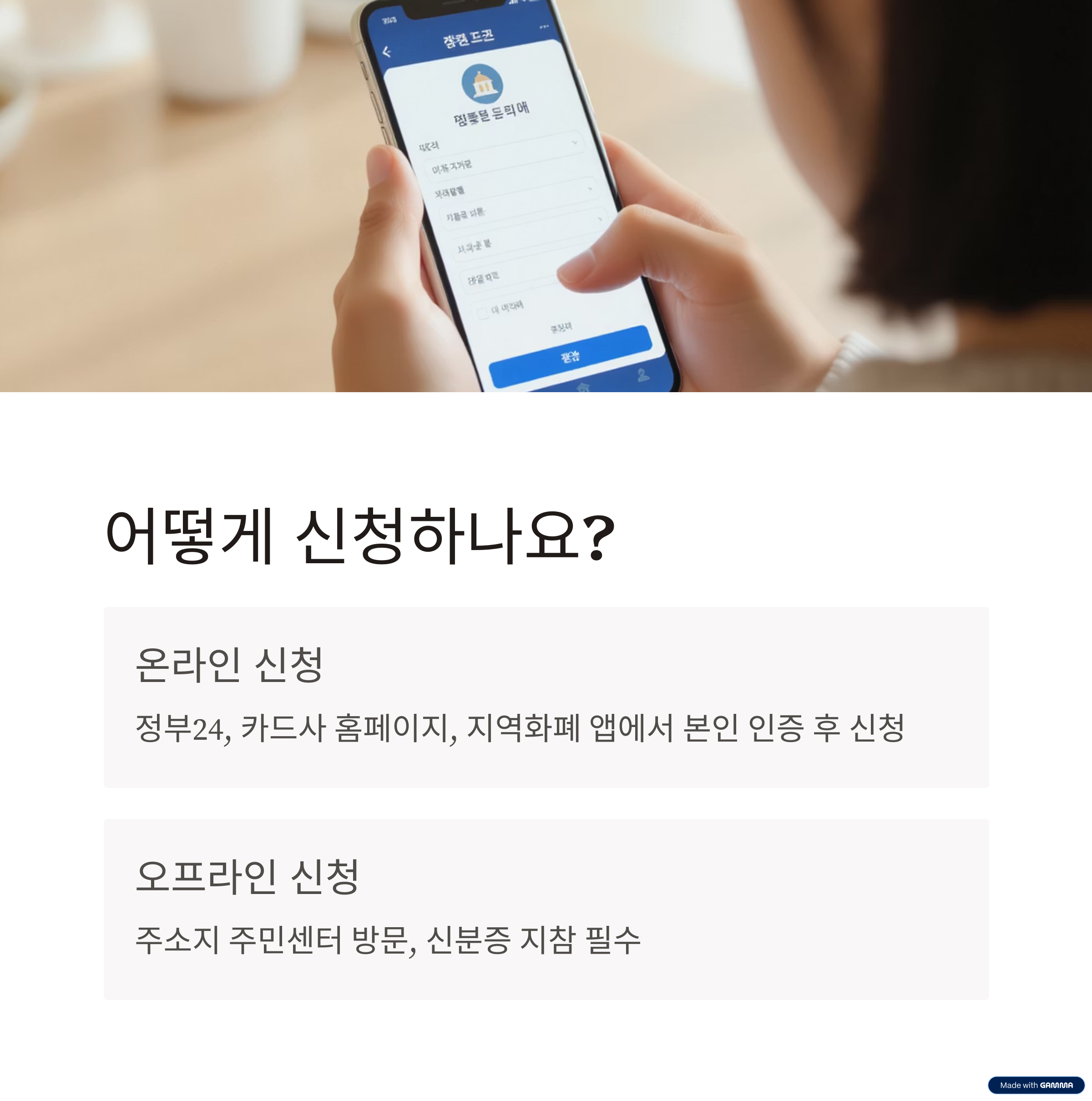 - 온라인: 정부24, 각 카드사 홈페이지, 지역화폐 앱 등