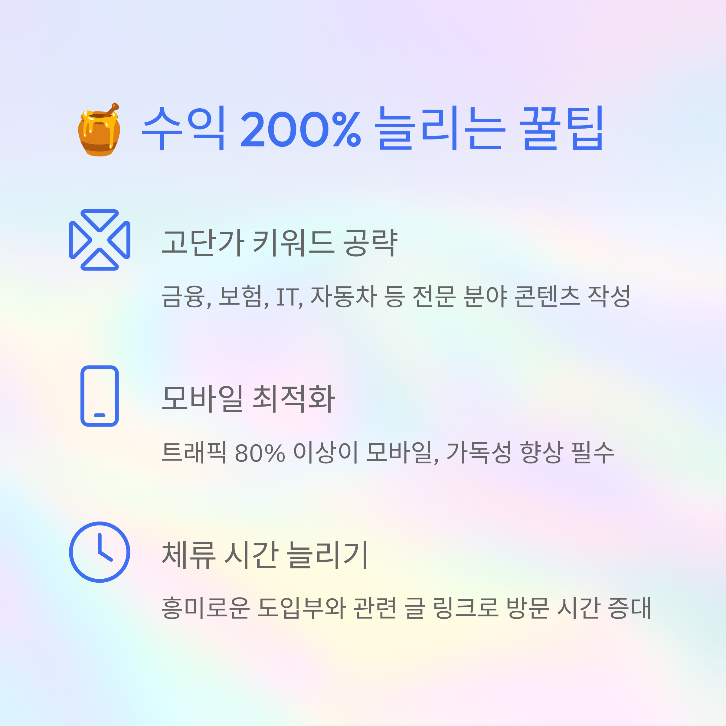 - 광고 단가 높은 키워드 공략: 금융(대출, 보험), 건강, IT, 자동차 등 광고주들이 선호하는 주제의 전문적인 글을 작성하면 자연스럽게 높은 단가의 광고가 붙습니다.