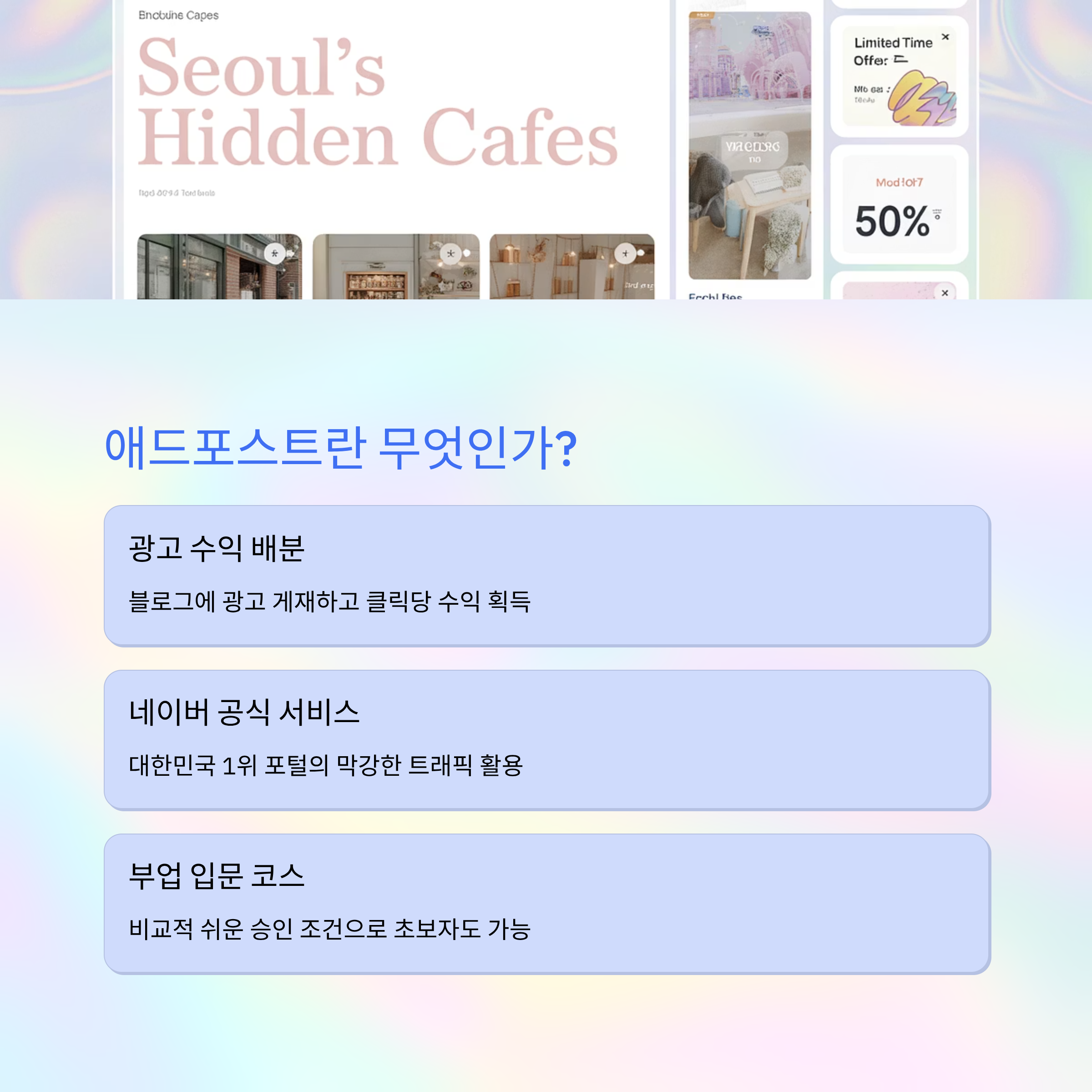 네이버 애드포스트는 내 블로그에 광고를 게재하고, 방문자가 광고를 클릭하거나 시청할 때마다 수익을 얻는 네이버 공식 광고 수익 배분 서비스입니다. 구글 애드센스와 비교하면 수익이 적다는 편견도 있지만, 대한민국 1위 포털 네이버의 막강한 트래픽을 활용할 수 있다는 점, 그리고 비교적 까다롭지 않은 승인 조건 덕분에 블로그 부업의 입문 코스로는 단연 최고입니다. 실제로 많은 블로거가 애드포스트 수익만으로 월 30만 원, 50만 원, 많게는 수백만 원의 파이프라인을 구축하고 있습니다. 글쓰기를 좋아하고 꾸준히 포스팅할 열정만 있다면, 당신도 충분히 가능합니다!