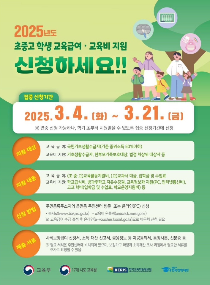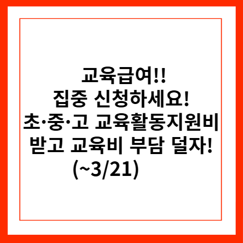 🌟 자녀 교육비 걱정, 이제 조금이나마 덜어보세요! 교육부가 저소득층 학생들을 위해 교육급여 집중 신청 기간을 운영합니다. 2025년 3월 4일부터 21일까지, 교육급여 신청하고 교육활동지원비 받으세요! 📝