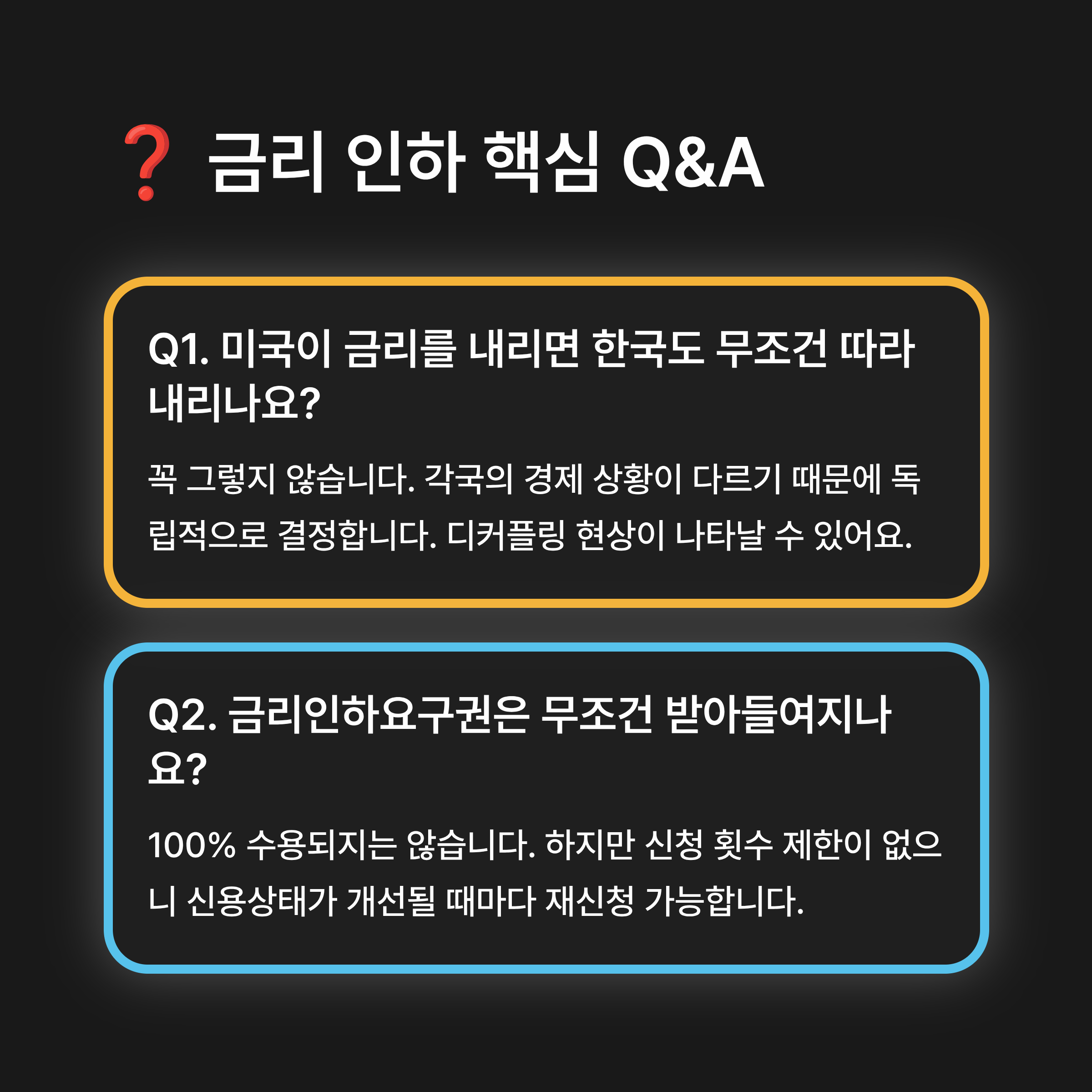 2025년 9월, 미국은 금리 인하의 첫발을 내디딜 가능성이 높고, 한국은 다음 10월의 결정을 위한 숨 고르기에 들어갑니다. 세상은 빠르게 변하고, 정보는 곧 돈입니다. 거시 경제의 흐름을 읽는 지혜와 함께, '금리인하요구권'처럼 내게 주어진 권리를 적극적으로 활용하는 현명함이 그 어느 때보다 필요한 시점입니다.