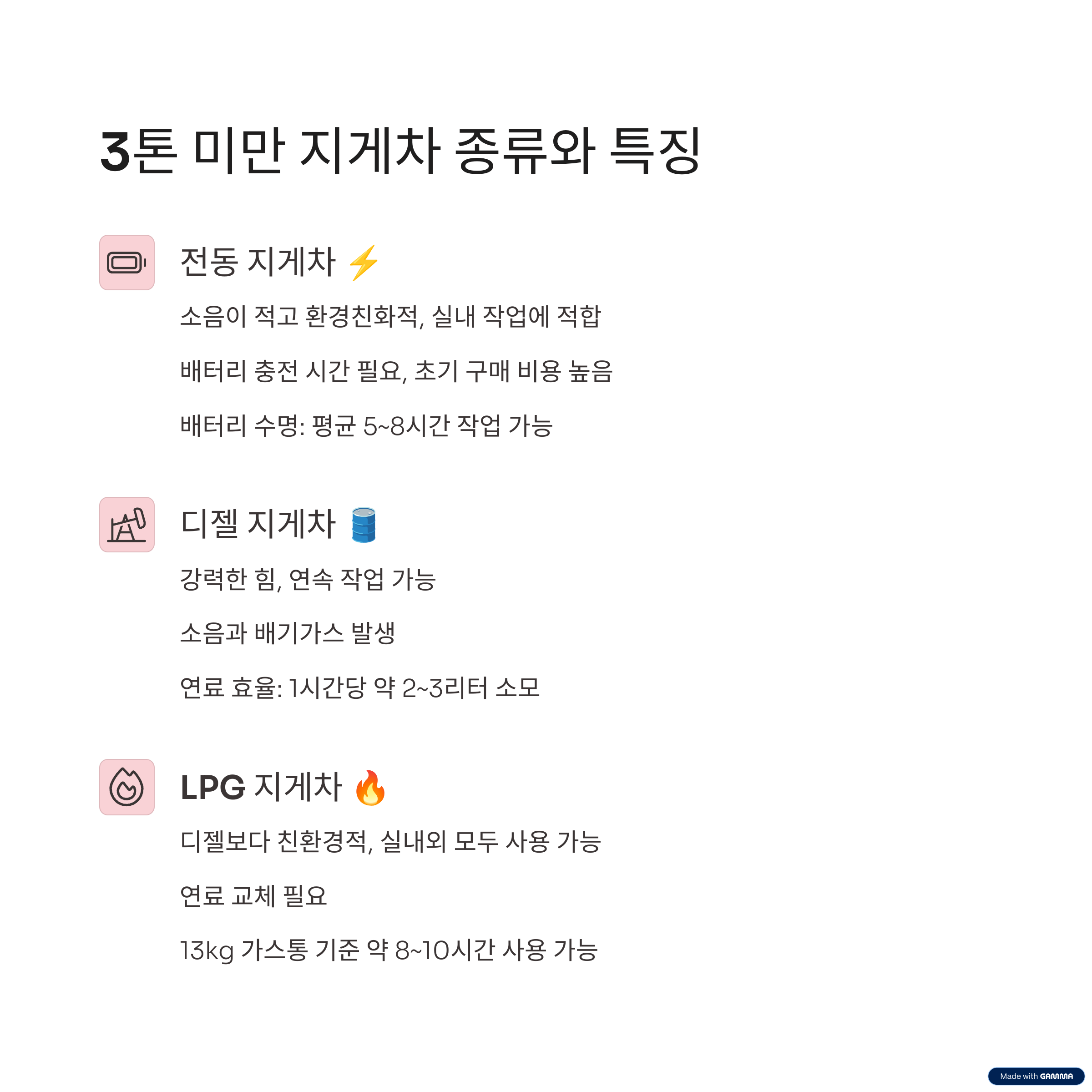 3톤 미만 지게차는 다양한 산업 현장에서 유용하게 사용되며, 좁은 공간에서도 높은 기동성을 발휘합니다.