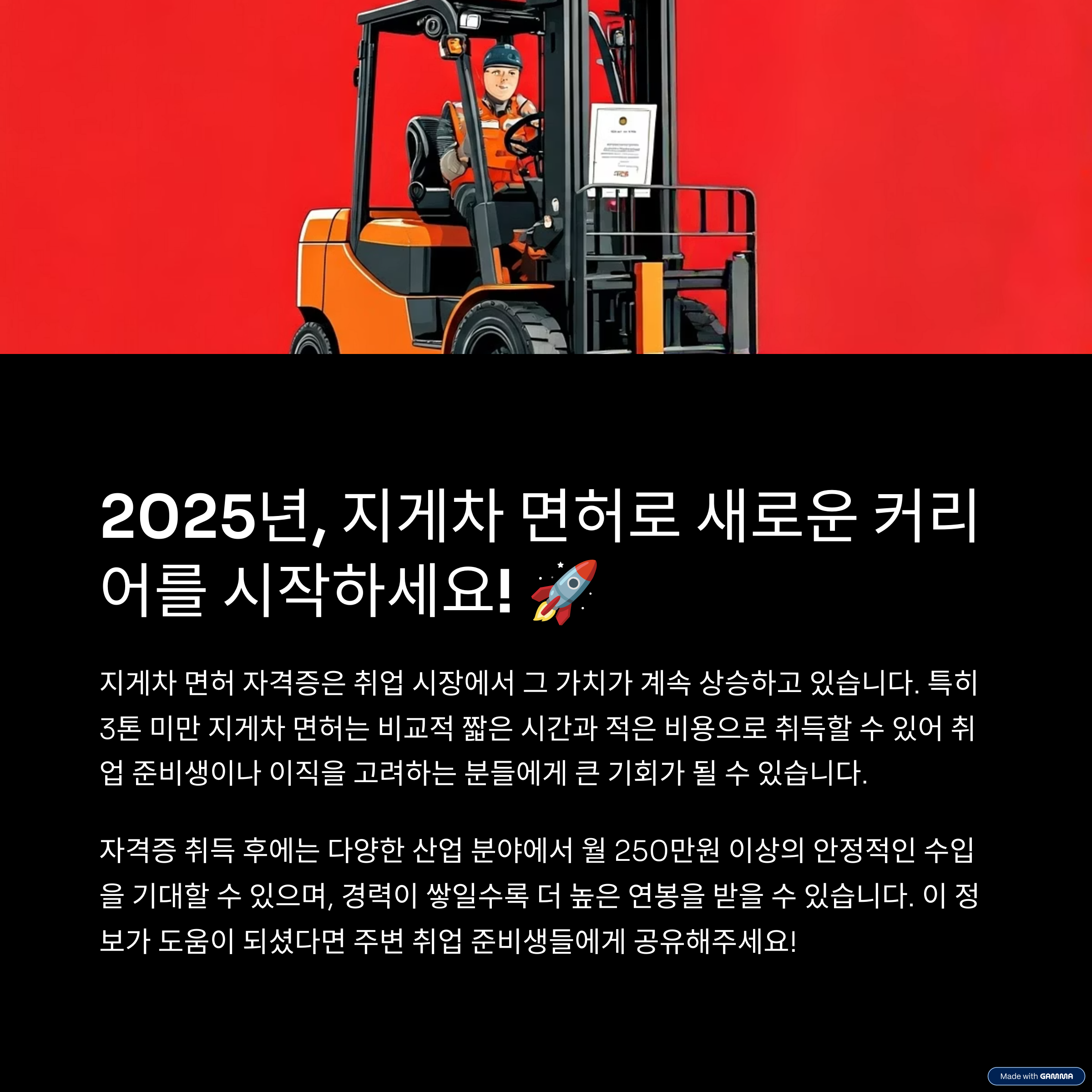 자격증 취득 후에는 다양한 산업 분야에서 월 250만원 이상의 안정적인 수입을 기대할 수 있으며, 경력이 쌓일수록 더 높은 연봉을 받을 수 있습니다. 2025년, 지게차 면허로 새로운 커리어를 시작해보는 건 어떨까요? 🚀