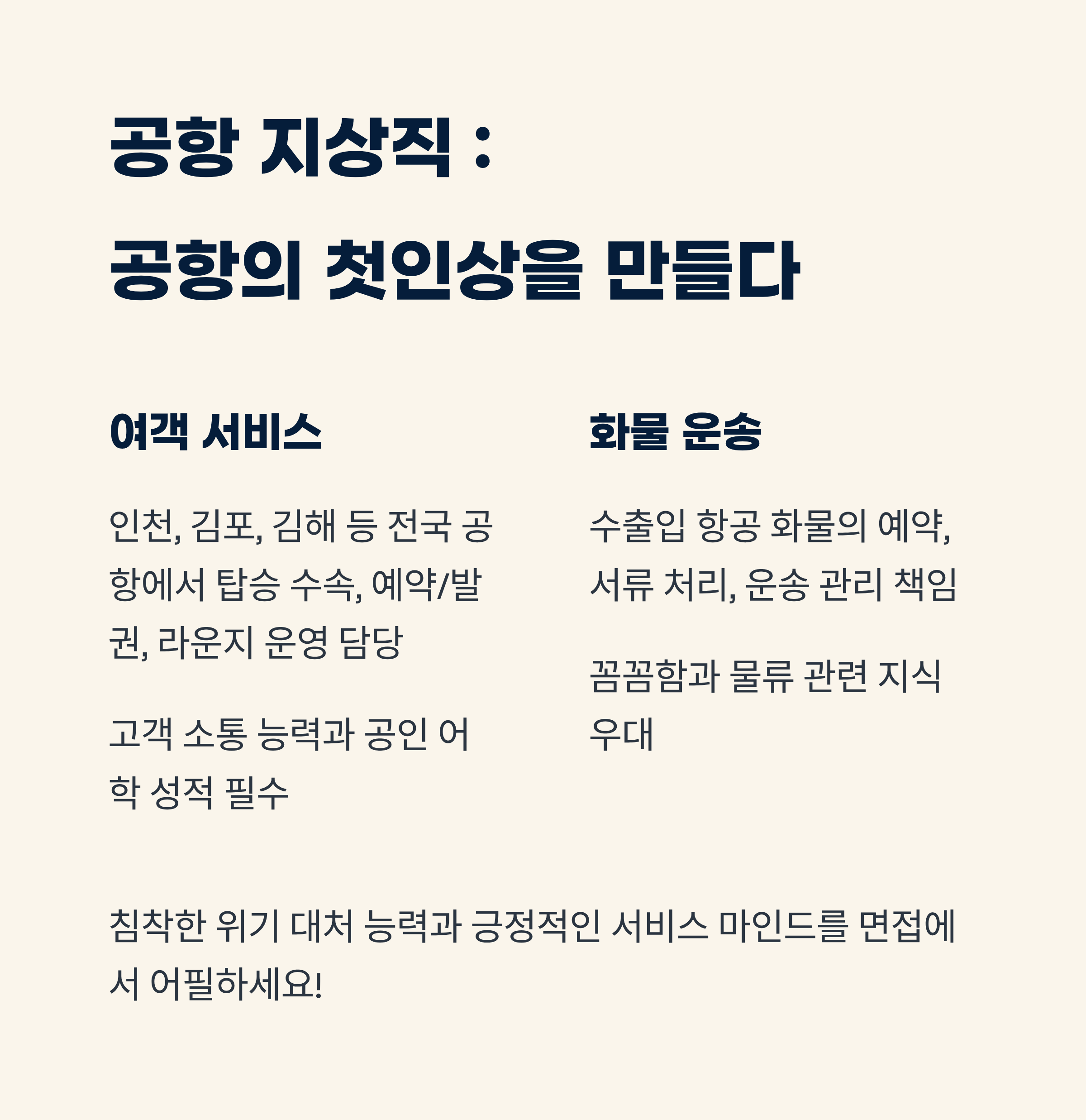 📌 이것만은 꼭! 지상직은 예기치 못한 상황이 많이 발생하는 만큼, 침착한 위기 대처 능력과 긍정적인 서비스 마인드를 면접에서 어필하는 것이 매우 중요합니다.
