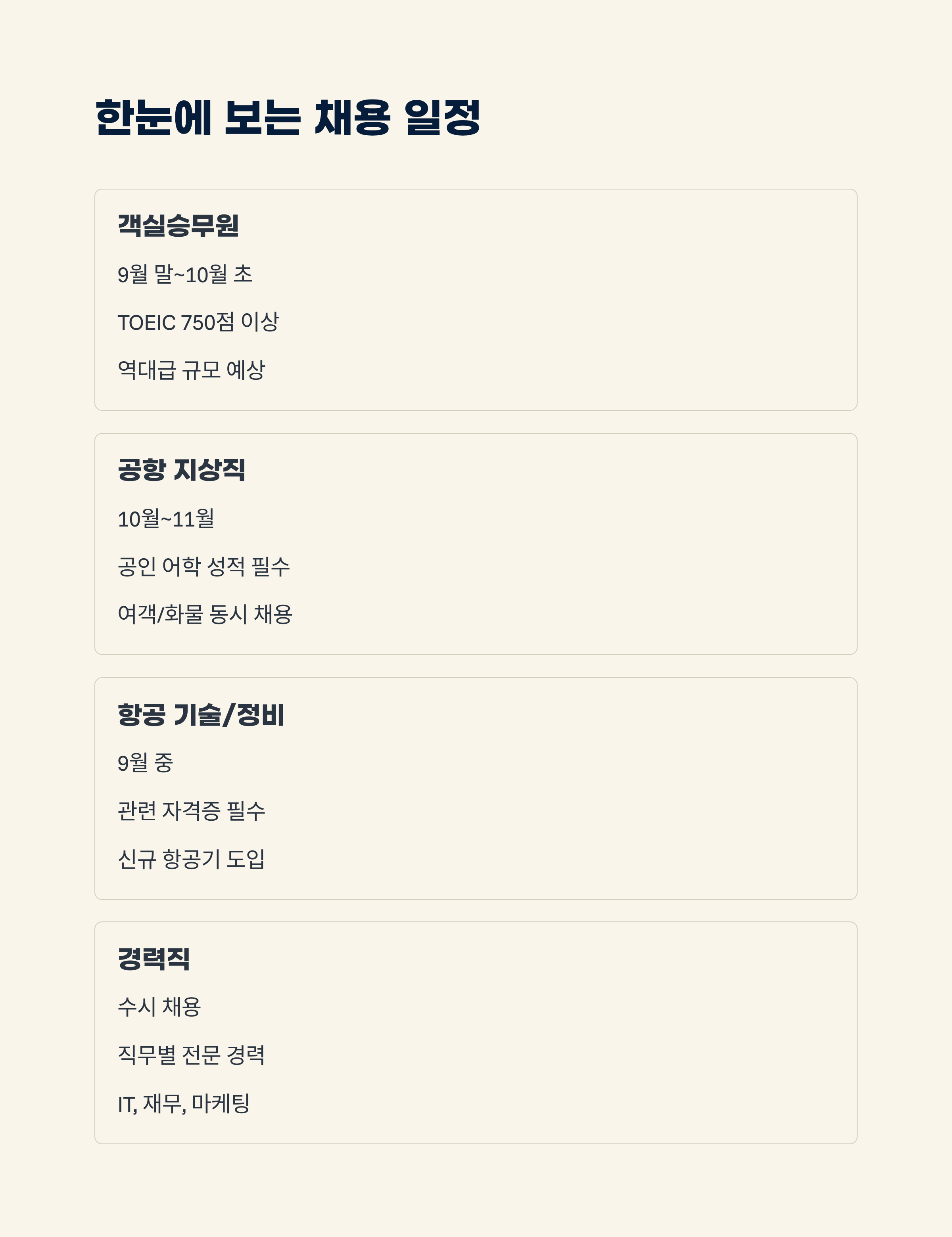 | ✈️ 객실승무원 | 2025년 9월 말 ~ 10월 초 | TOEIC 750점 이상, 교정시력 1.0 이상 | 역대급 규모 예상, 제2외국어 우대 |