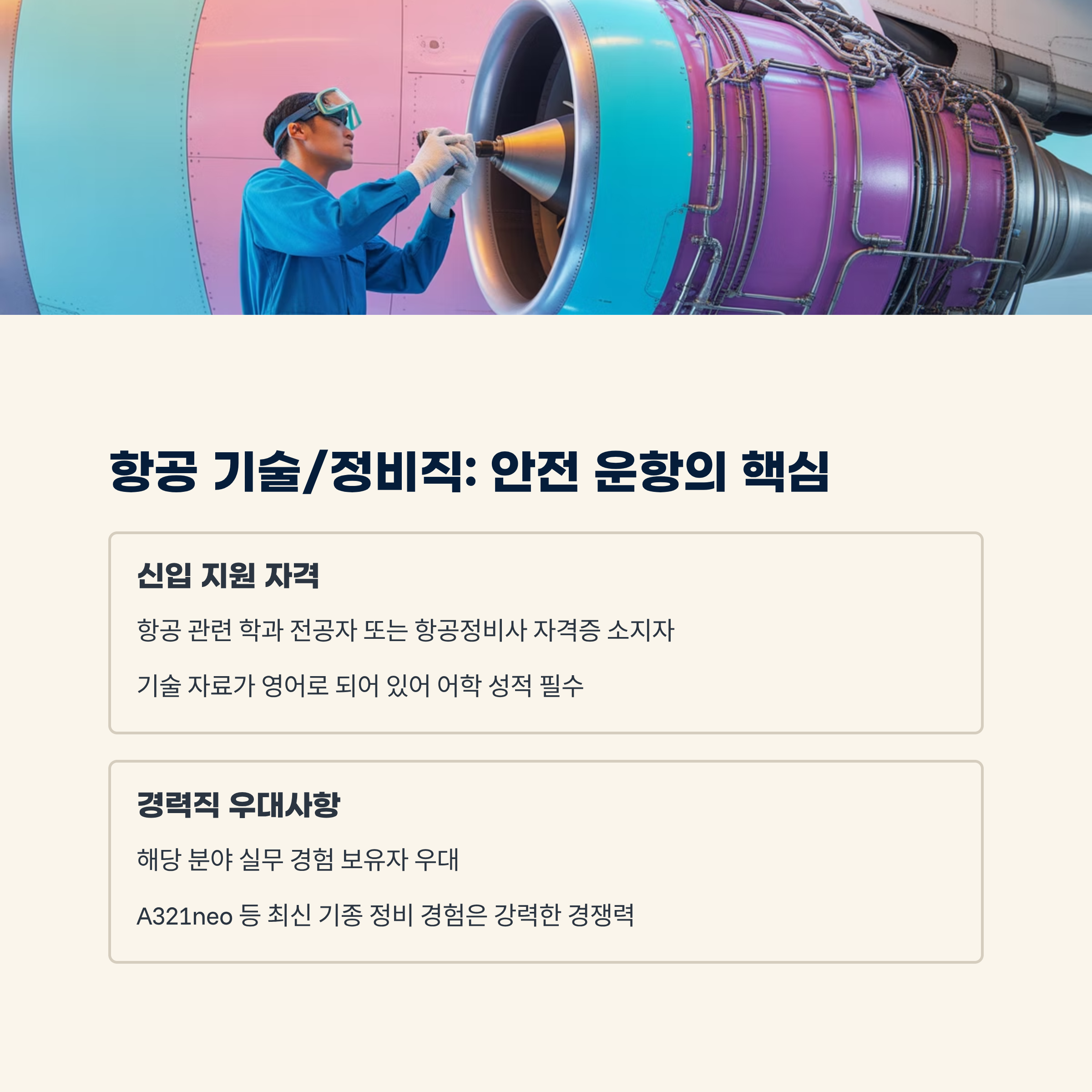 - 경력: 해당 분야 실무 경험이 있는 전문가를 우대하며, 특히 최신 기종에 대한 정비 경험은 강력한 경쟁력이 됩니다.