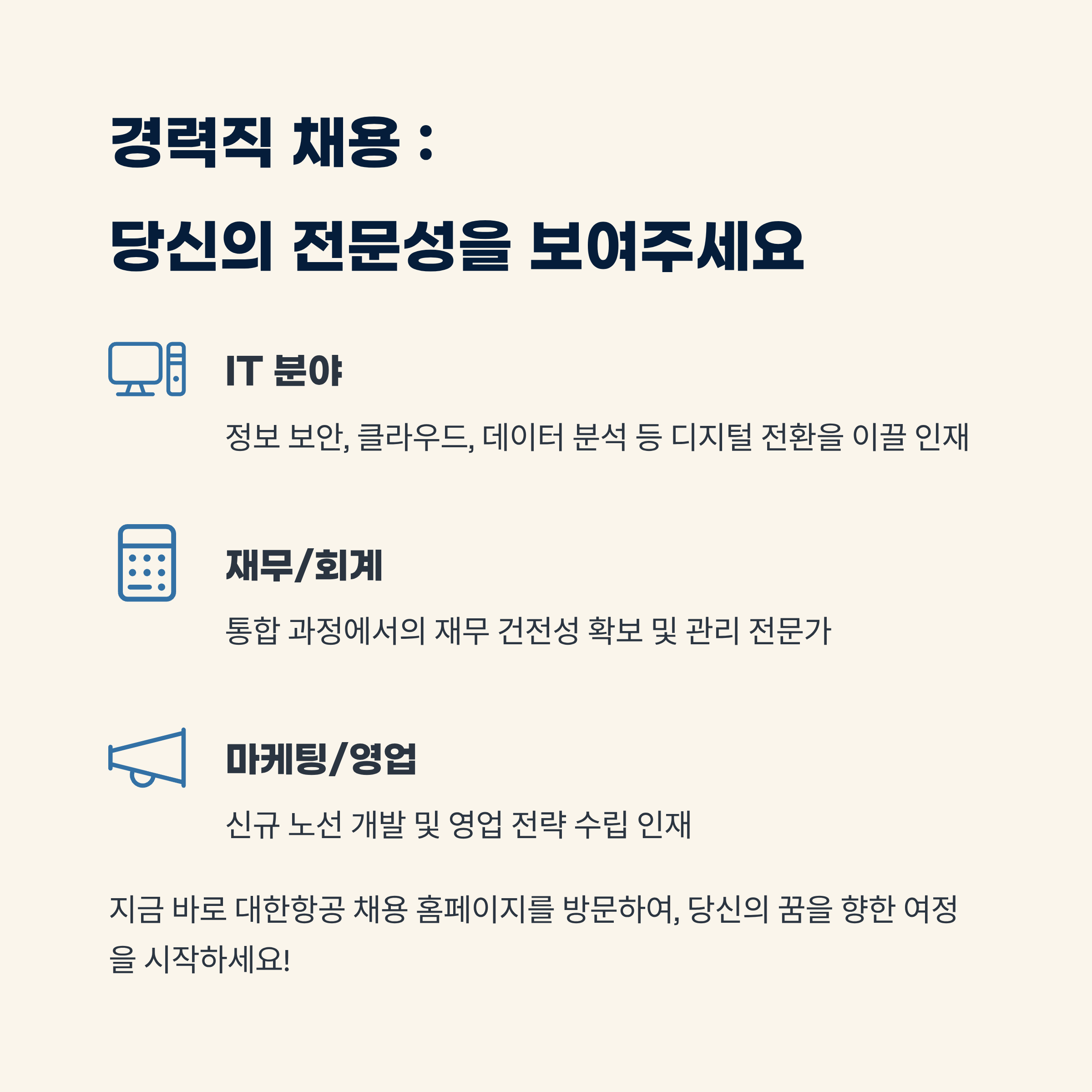 대한항공은 아시아나항공 통합이라는 거대한 변화를 성공적으로 이끌기 위해 각 분야의 전문가를 수시로 채용하고 있습니다.