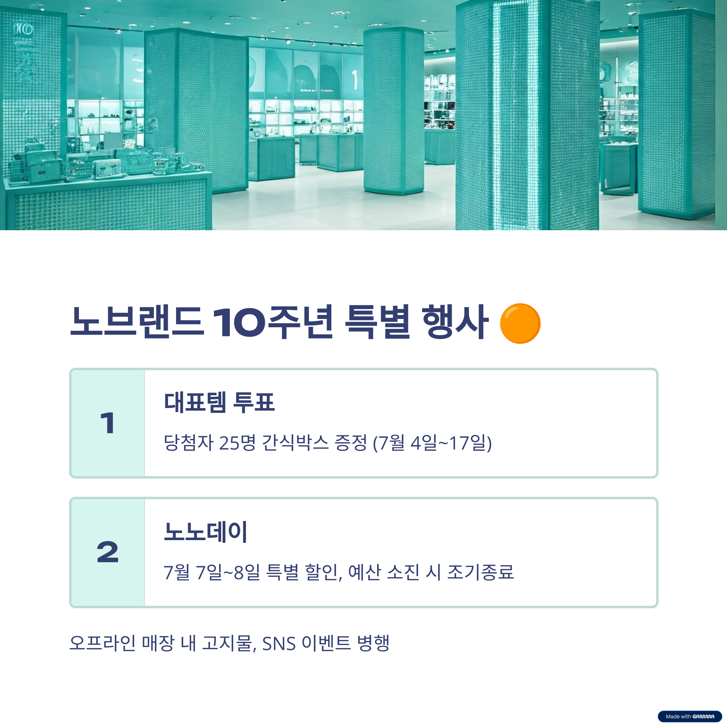 노브랜드 | 7.4~7.17, 7.7~7.8 | 10주년 대표템 투표, 간식박스 경품, 노노데이 | 예산 소진 시 조기종료, SNS 이벤트 |
