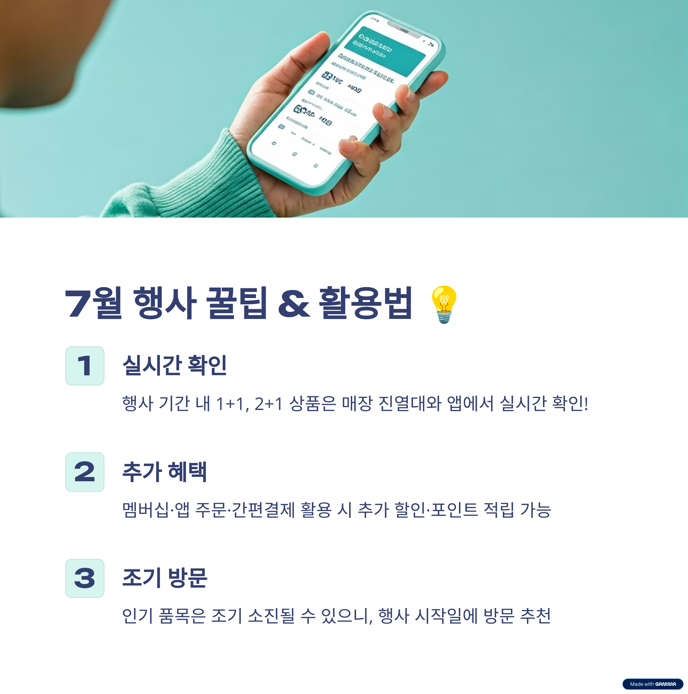 - 행사 기간 내 1+1, 2+1 상품은 매장 진열대와 앱에서 실시간 확인!