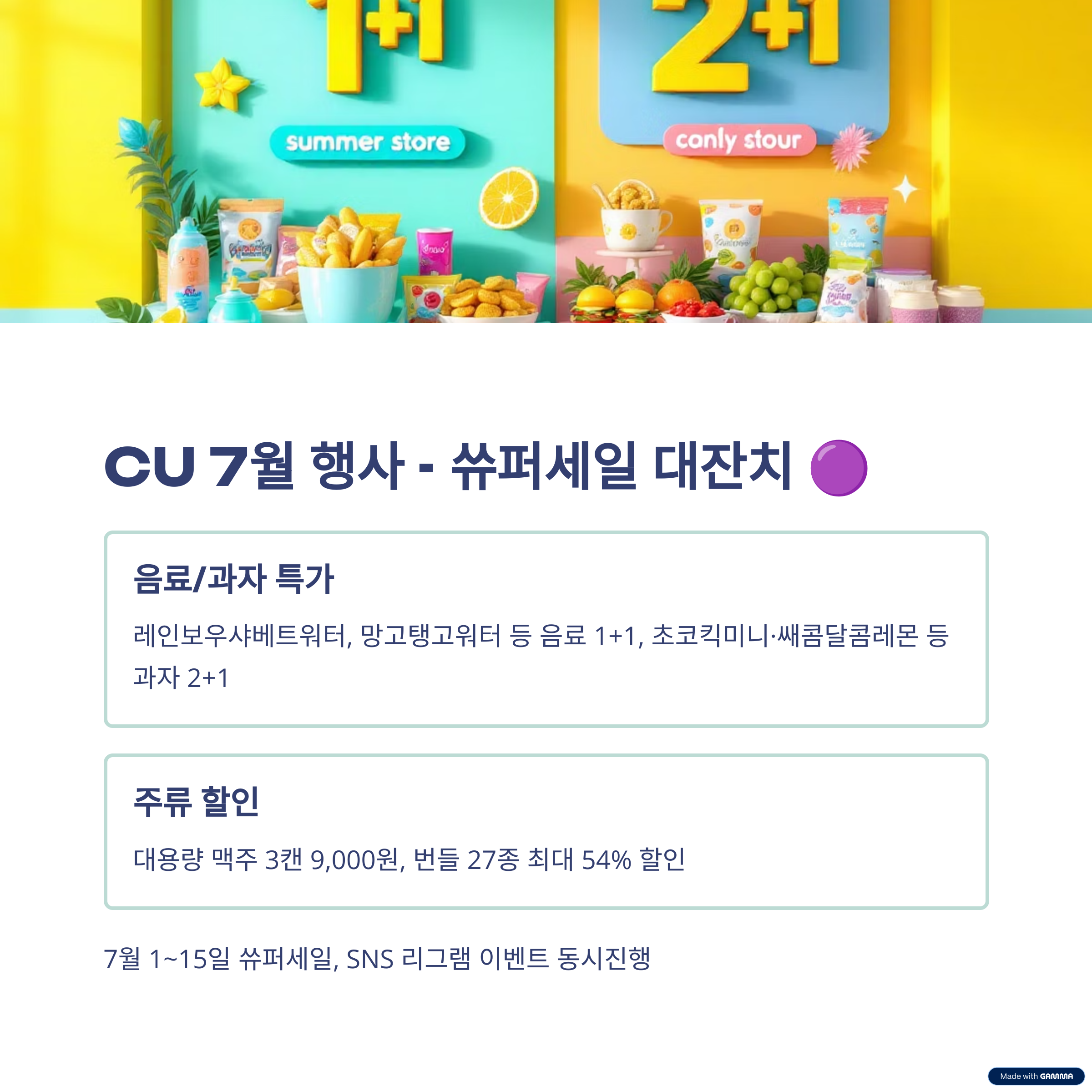 CU | 7.1~7.31 | 음료/과자/아이스크림 1+1, 2+1, 주류 3캔 9,000원 | 최대 54% 할인, 쓔퍼세일, SNS 이벤트 |