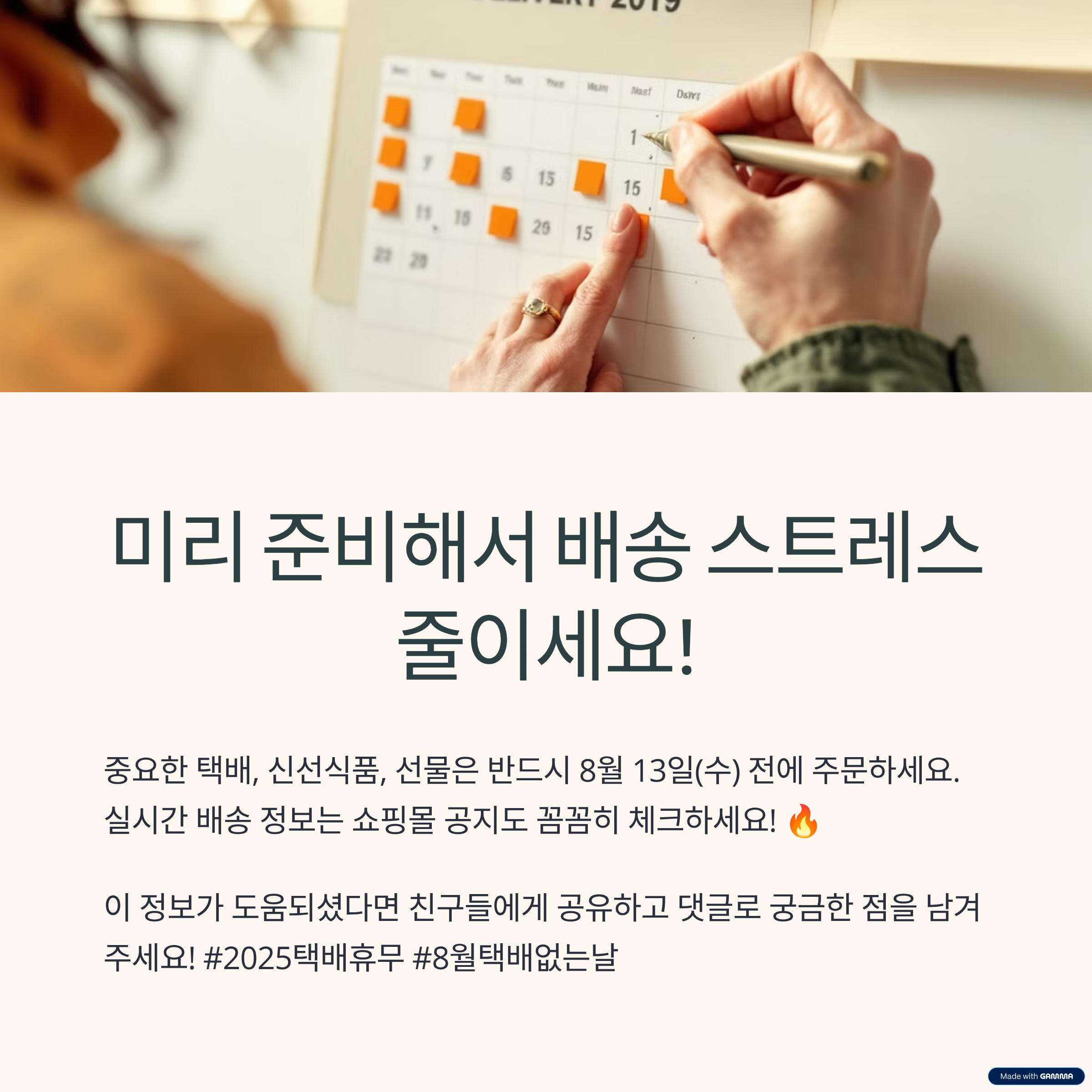 중요한 택배, 신선식품, 선물 등은 반드시 8월 13일(수) 전에 주문하세요!