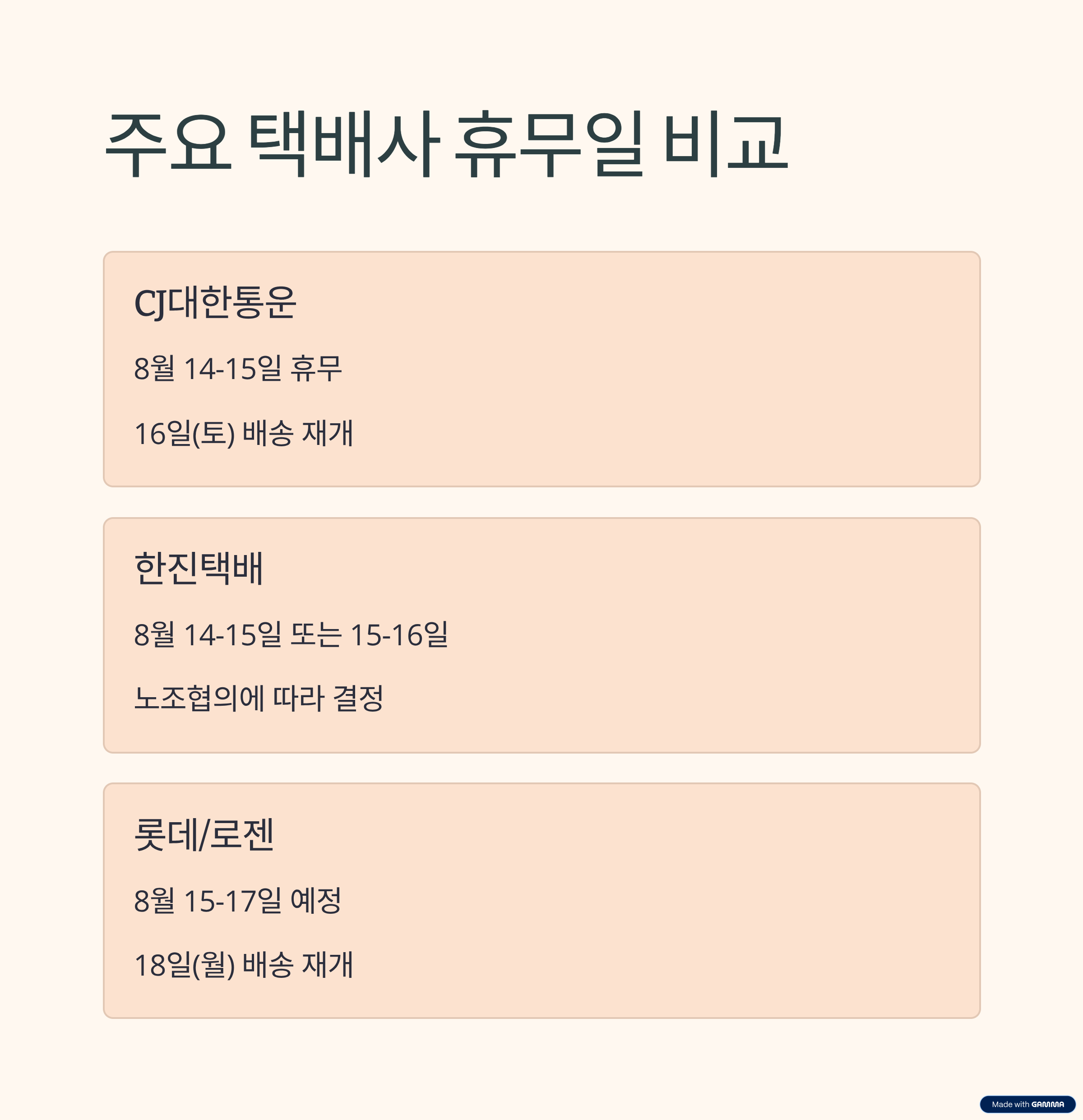 - CJ대한통운, 우체국 등: 8월 14~15일 “완전 휴무”.