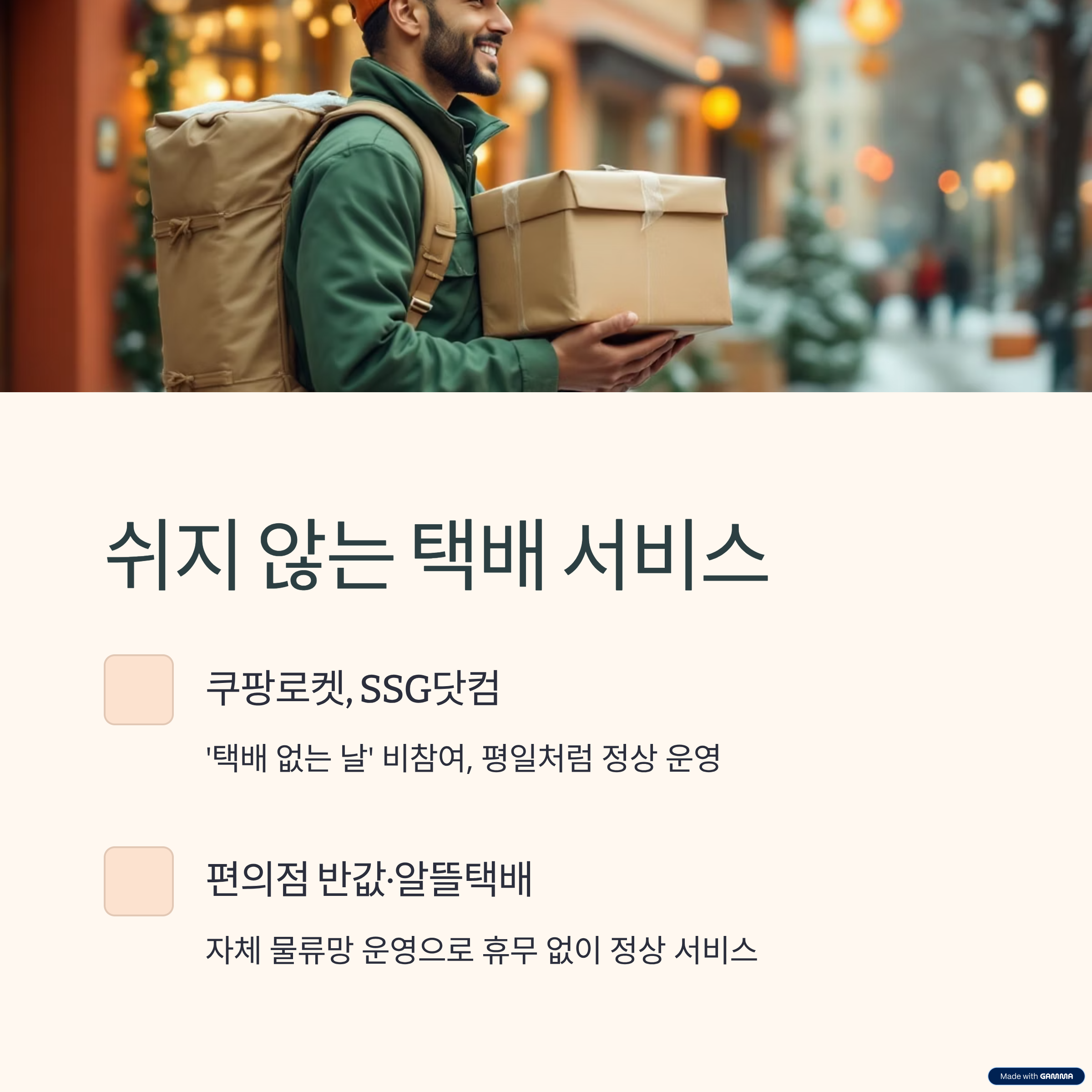 - 쿠팡·SSG·편의점 택배는 쉴 틈 없음, 그대로 ‘배송 OK’.