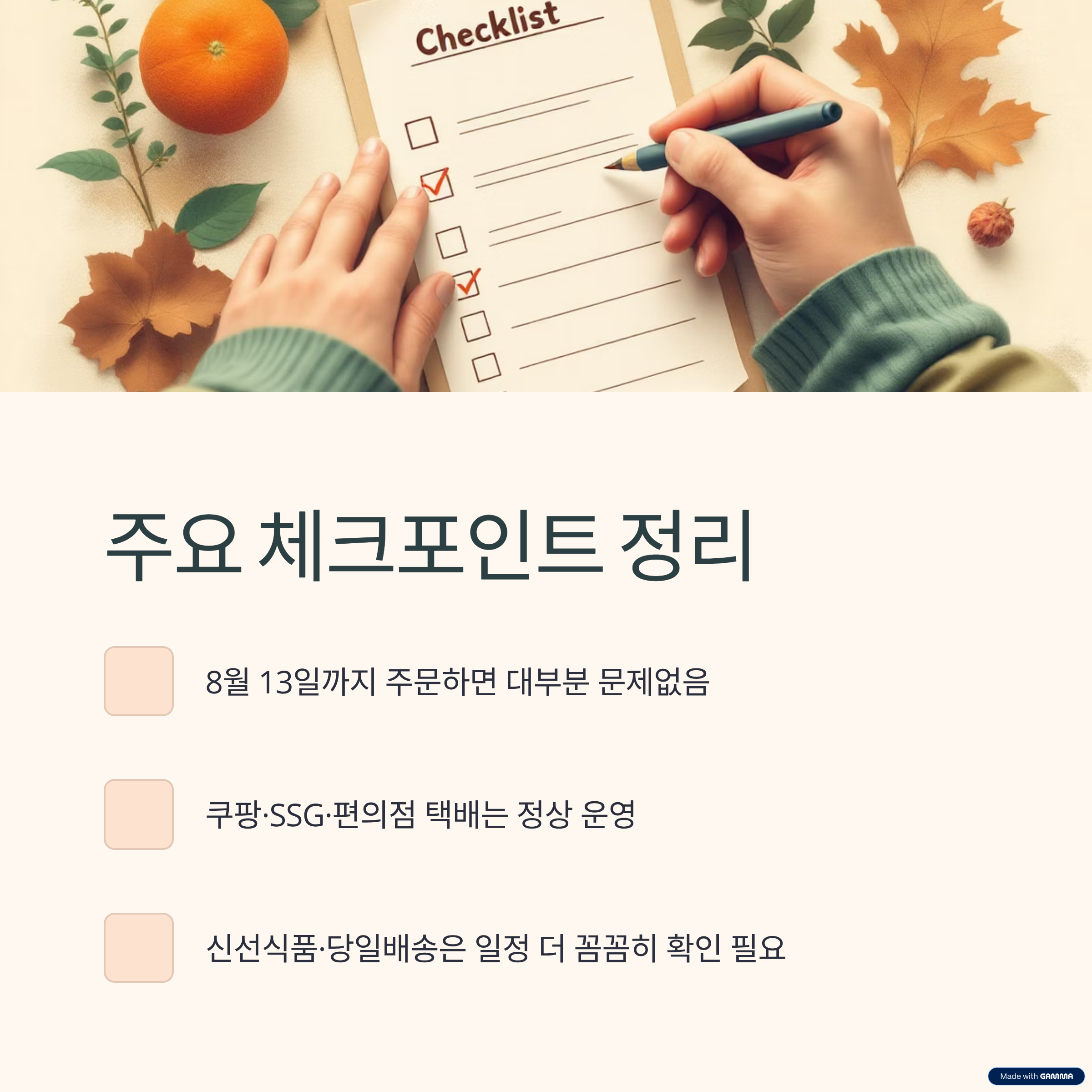 - 신선식품·당일배송 상품은 일정 더 꼼꼼히 확인 필요.