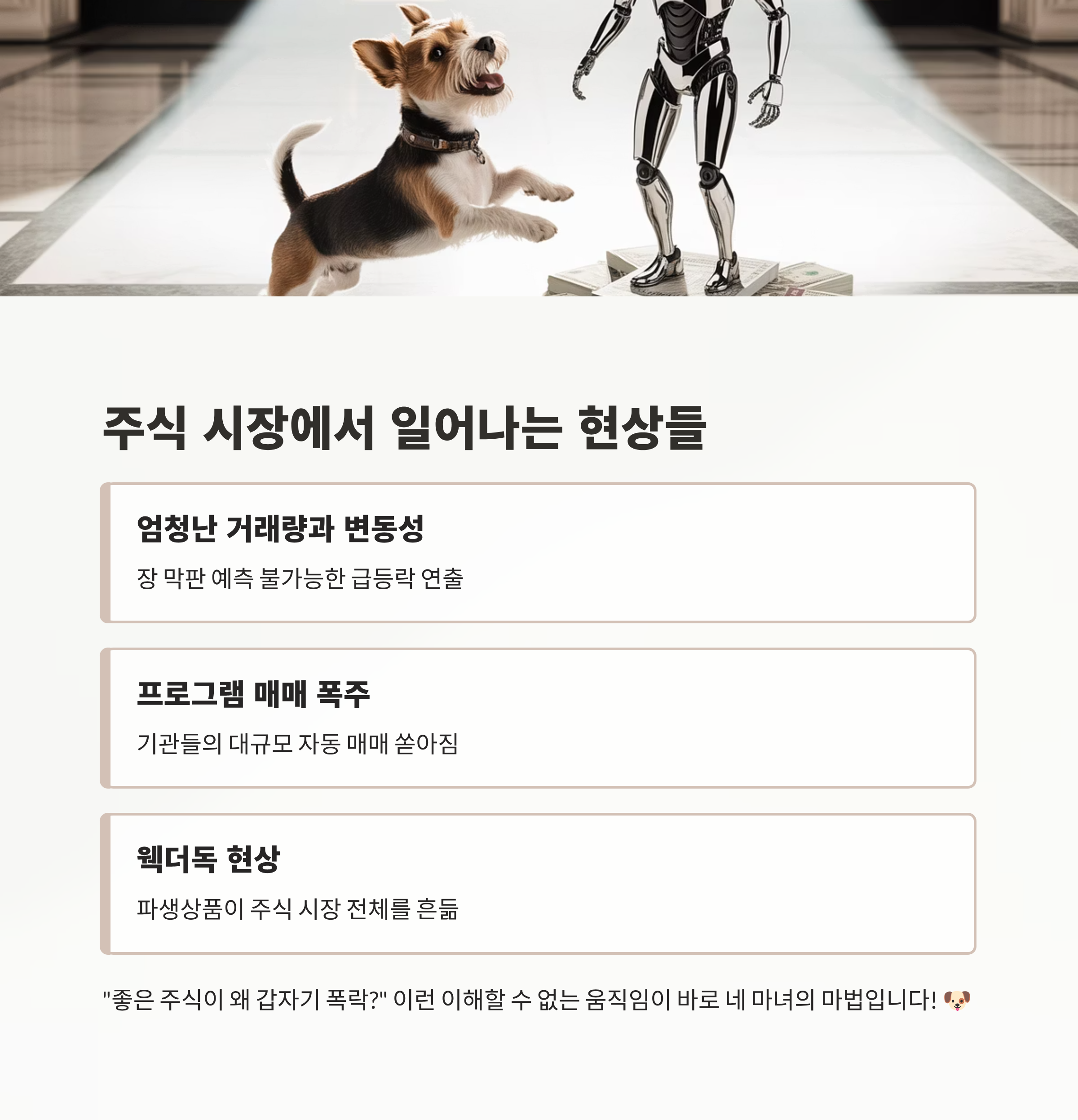- '웩더독(Wag the Dog)' 현상: '꼬리가 몸통을 흔든다'는 의미로, 파생상품 시장(꼬리)의 수급이 현물 주식 시장(몸통) 전체를 뒤흔드는 주객전도 현상이 발생합니다. A급 우량주가 아무 이유 없이 급락하는 현상도 이 때문입니다.