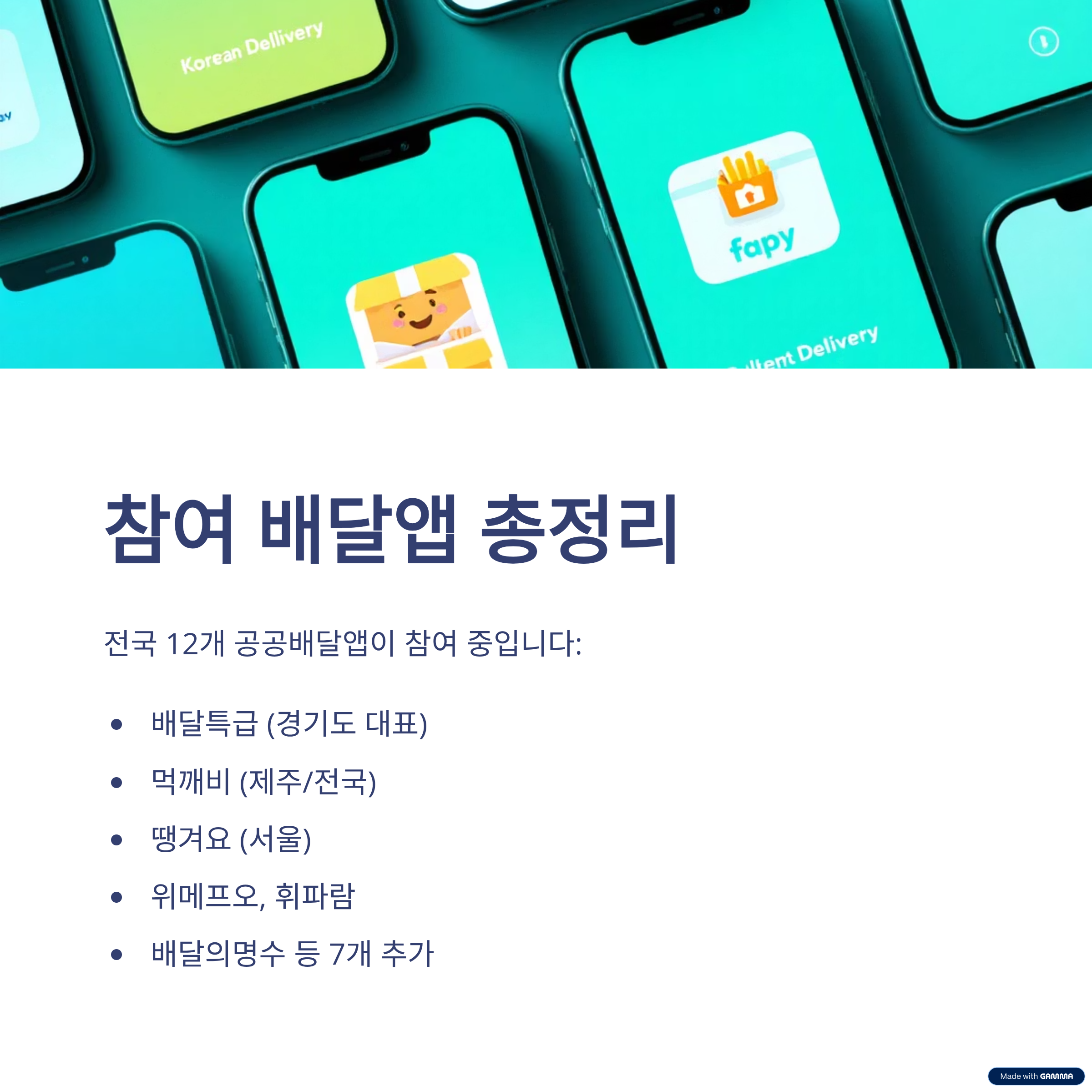 - 총 12개 대표 공공배달앱: 배달특급, 먹깨비, 위메프오, 땡겨요, 휘파람, 배달의명수 등