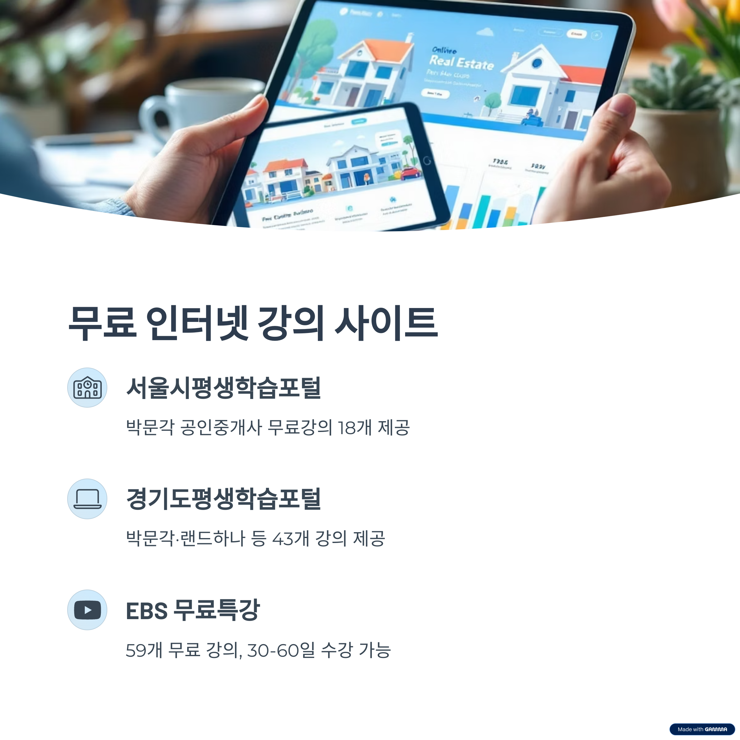 - 교수진: 강양구(부동산학개론), 이승현(민법), 임종성(공인중개사법) 등