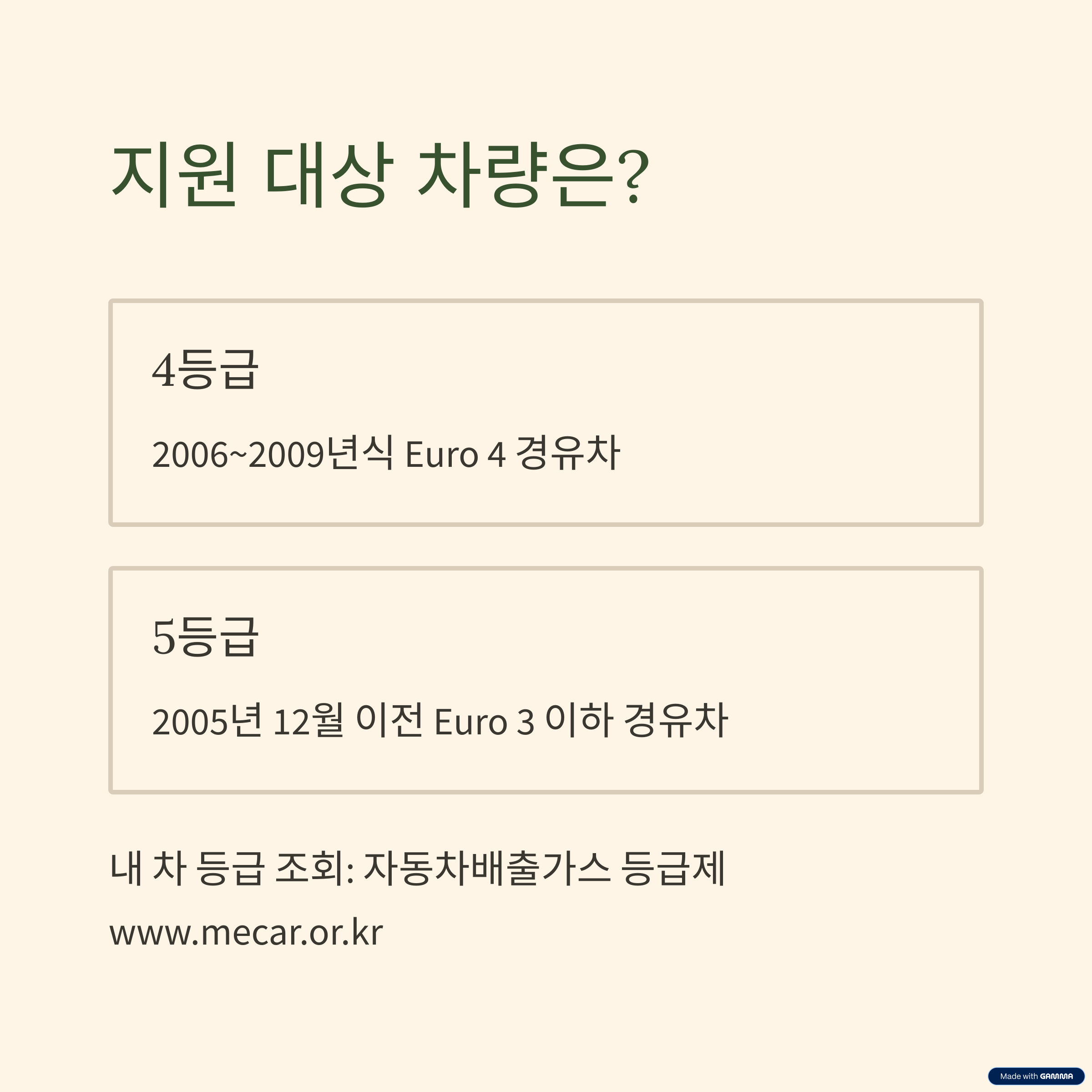 - 적용 차량: 배출가스 4등급(2006~2009년 Euro 4), 5등급(2005년 12월 이전 Euro 3 이하)