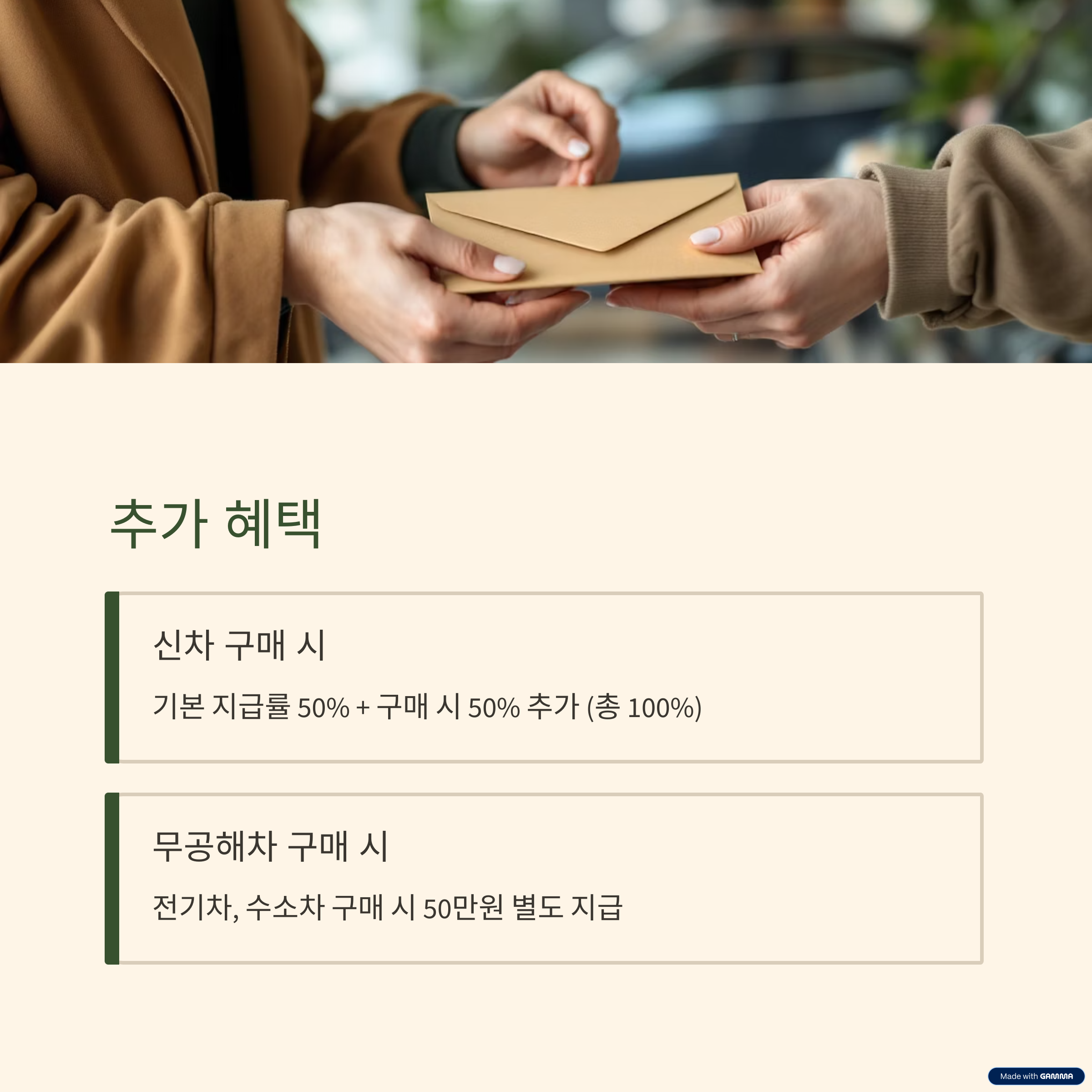 - 전기차, 수소차 등 무공해차 구매 시 50만 원 별도 지급