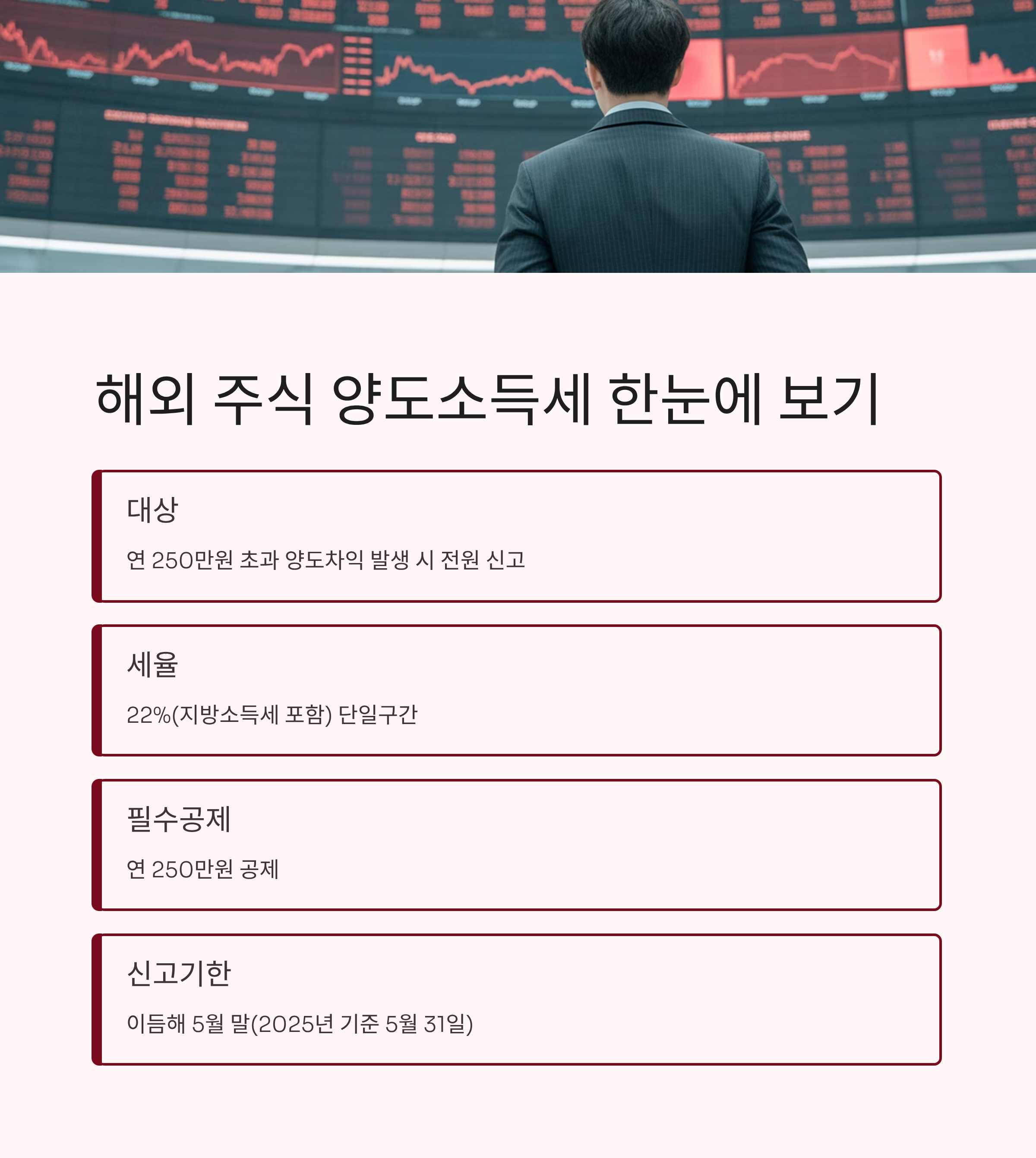 A: 해외주식은 대주주 구분 없이 연 250만원 초과 차익이면 누구나 22% 세율로 신고합니다. 신고 안 하면 가산세가 붙어요.