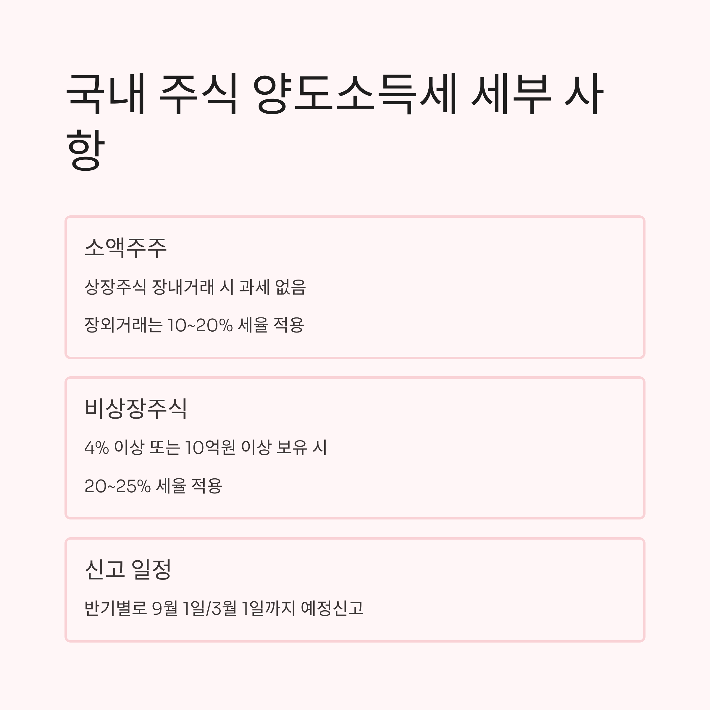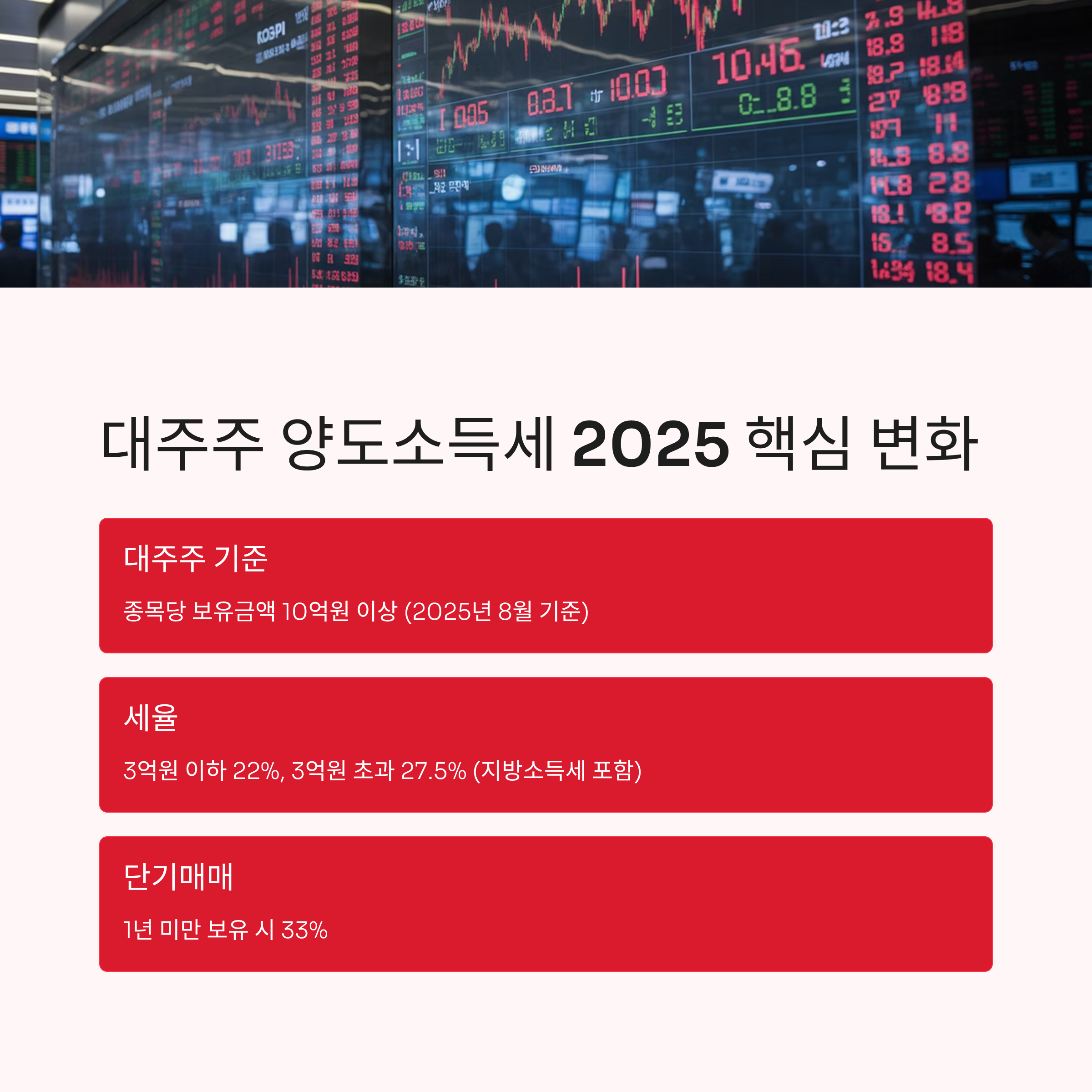 - 대주주 기준: 종목당 보유금액 10억원 이상(2025년 8월 기준)