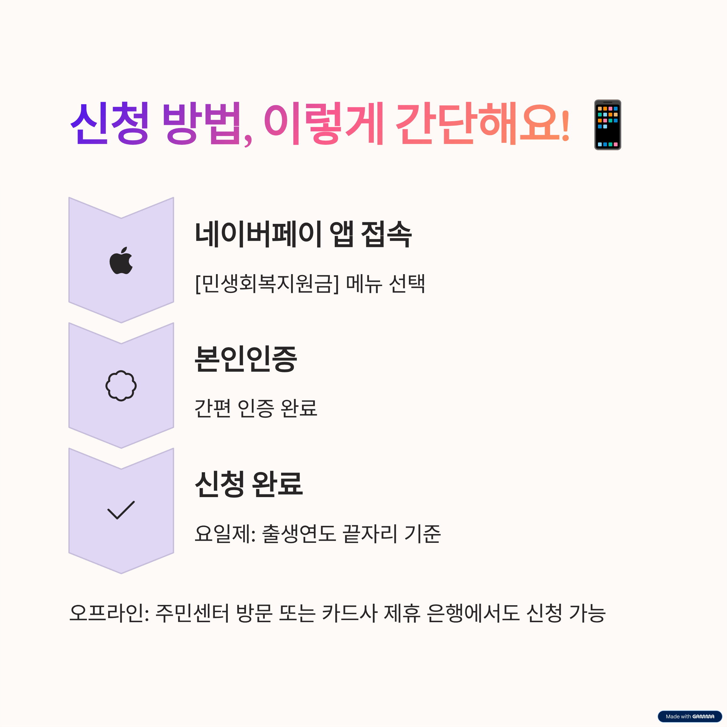 - 온라인 : 네이버페이 앱 접속 → [민생회복지원금] 메뉴 → 본인인증(간편)
