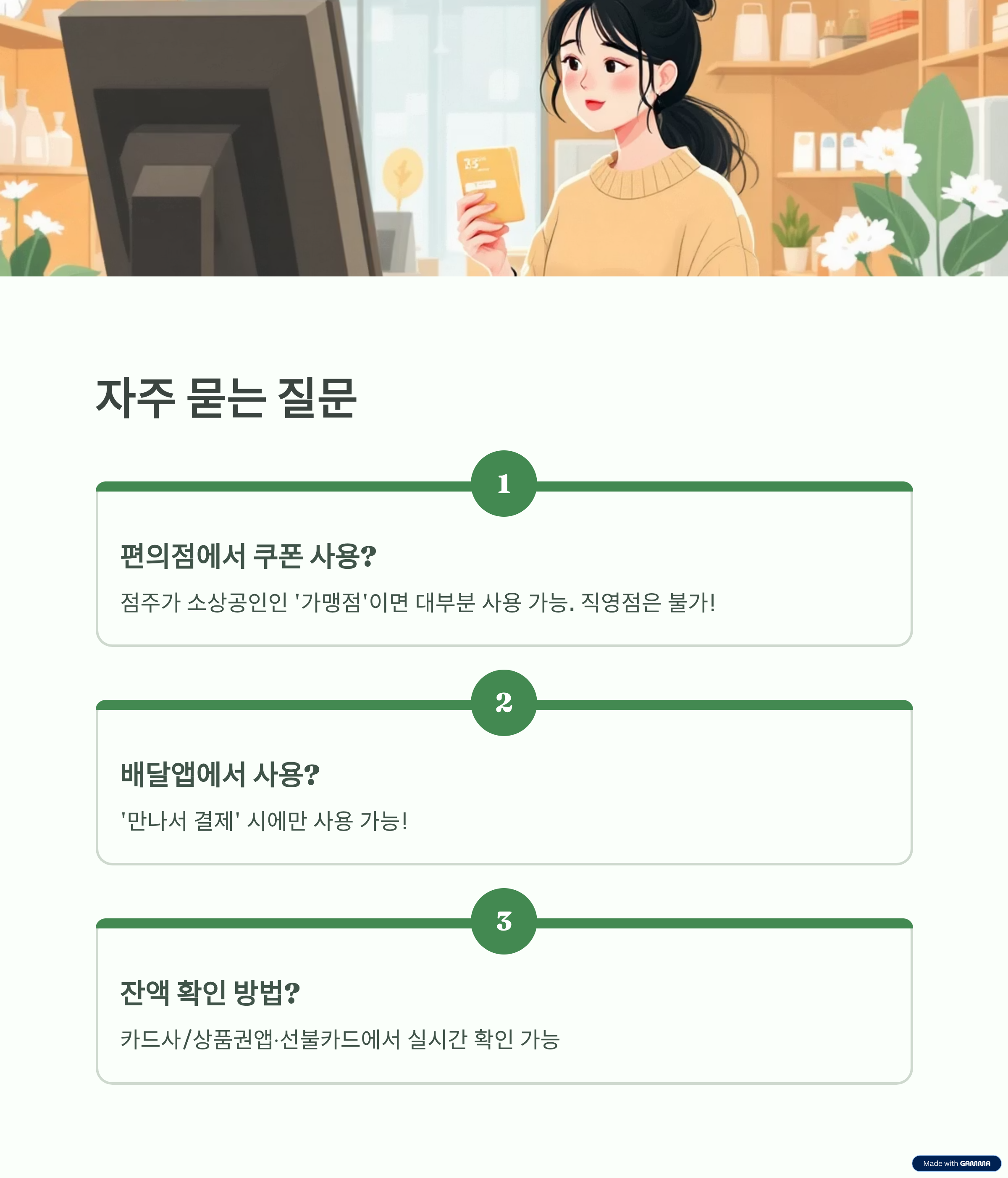 - GS25, CU, 세븐일레븐, 이마트24 등 대부분 편의점 가맹점에서 사용 가능