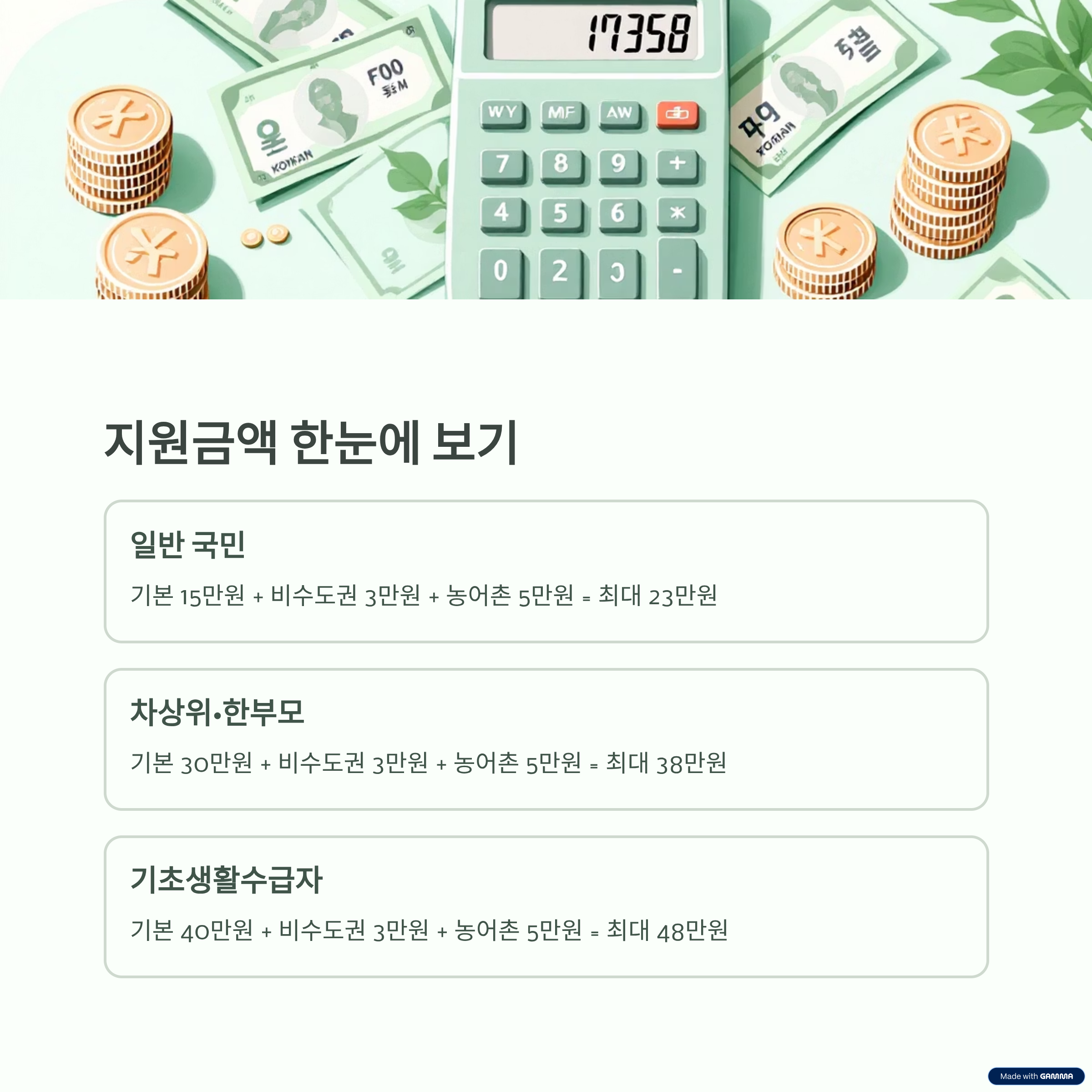 | 구분 | 기본금액 | 비수도권 추가 | 농어촌 추가 | 최대지급액 |