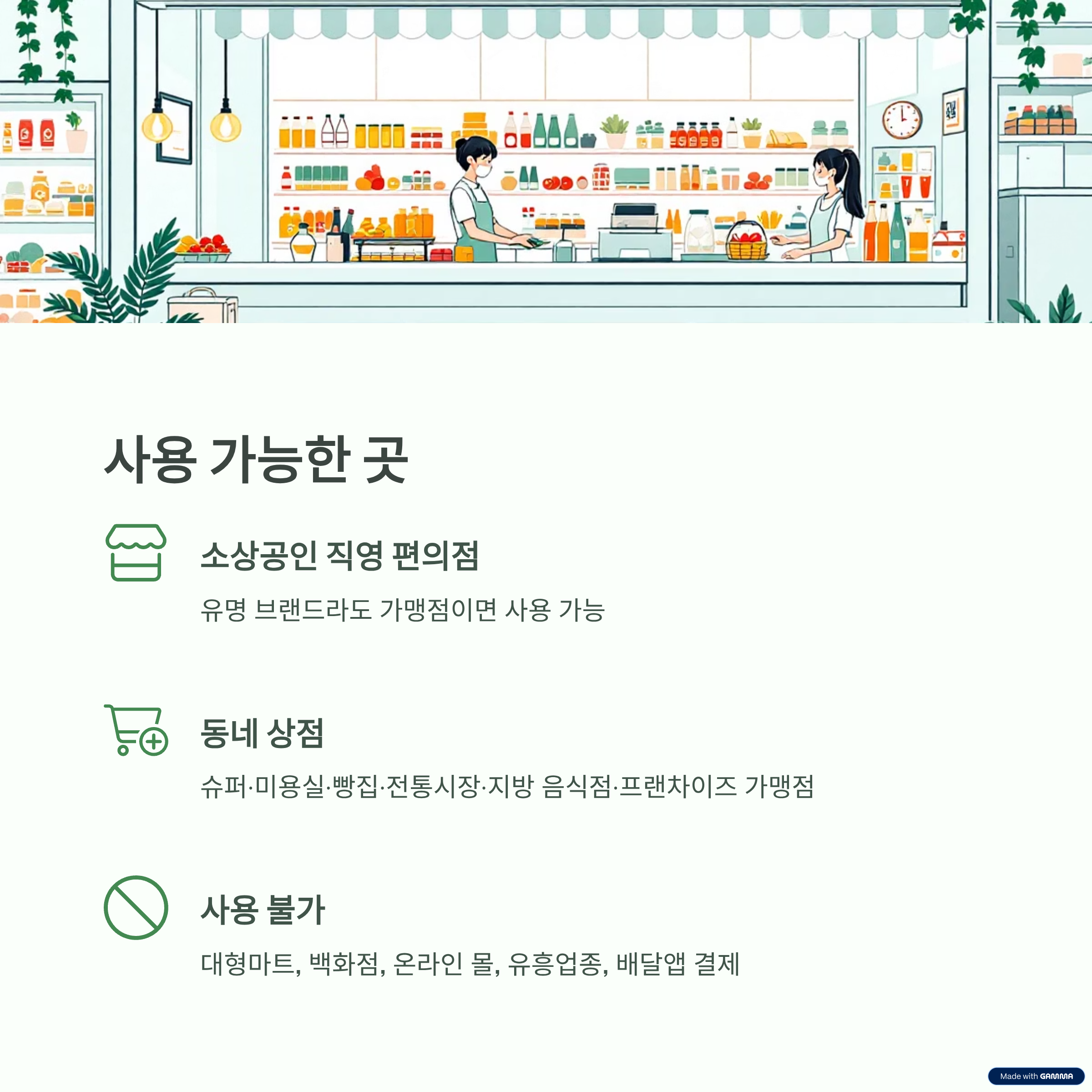 - 대부분의 대형 직영 매장은 사용 불가, 매장 내 '지역사랑상품권 사용 가능' 스티커를 확인