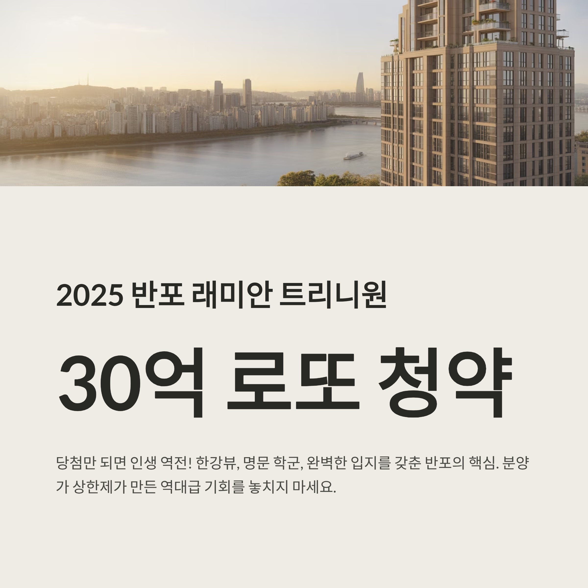2025년 서울 서초구 반포동에 들어서는 래미안 트리니원은 반포주공1단지 3주구를 재건축하는 대단지 아파트입니다. 한강 조망과 최고급 학군, 편리한 교통을 모두 갖춘 압도적인 입지 덕분에 분양 전부터 '30억 로또 청약'이라 불리며 시장의 모든 관심을 한 몸에 받고 있습니다.