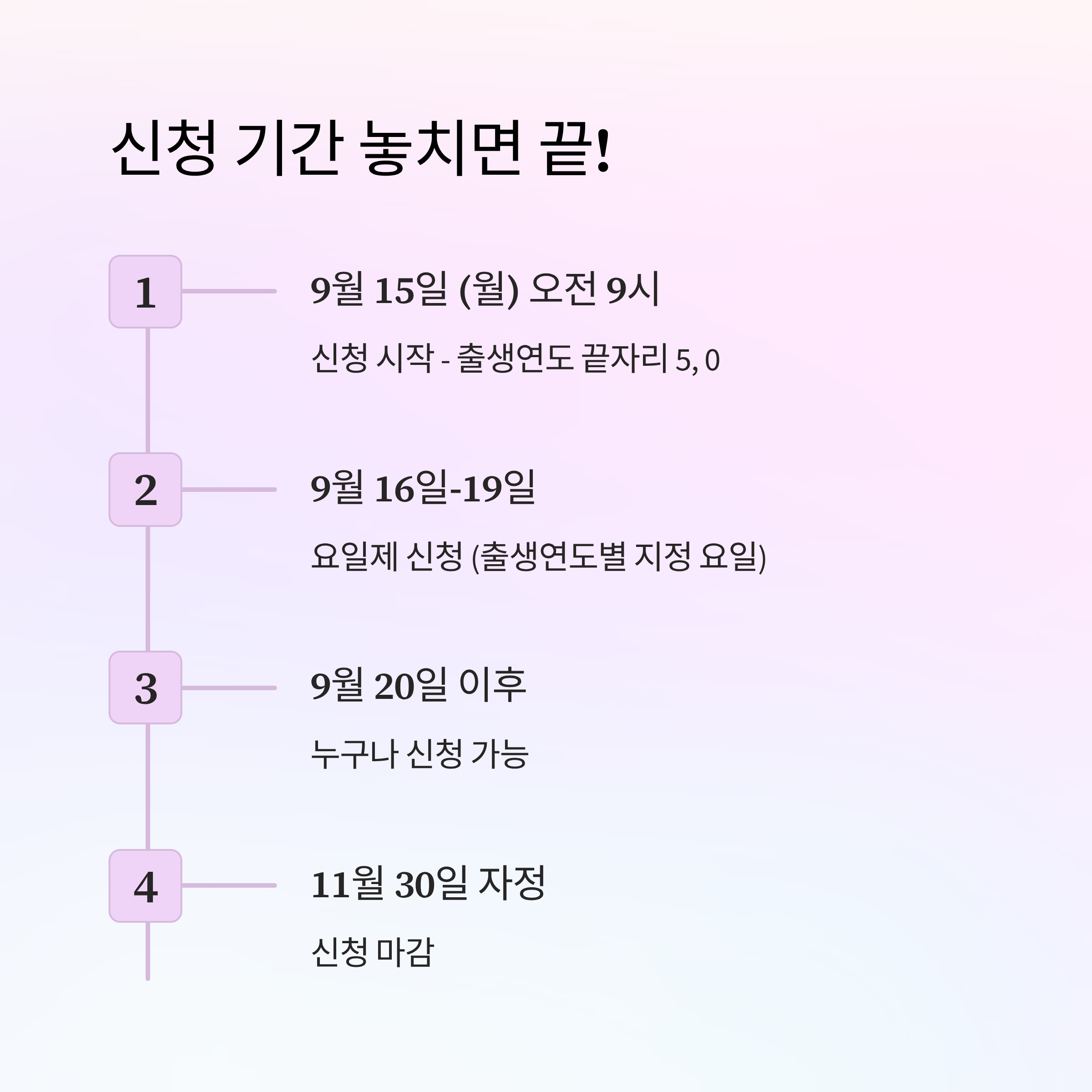 - 전체 신청 기간: 2025년 9월 15일 (월) 오전 9시 ~ 2025년 11월 30일 (일) 자정까지