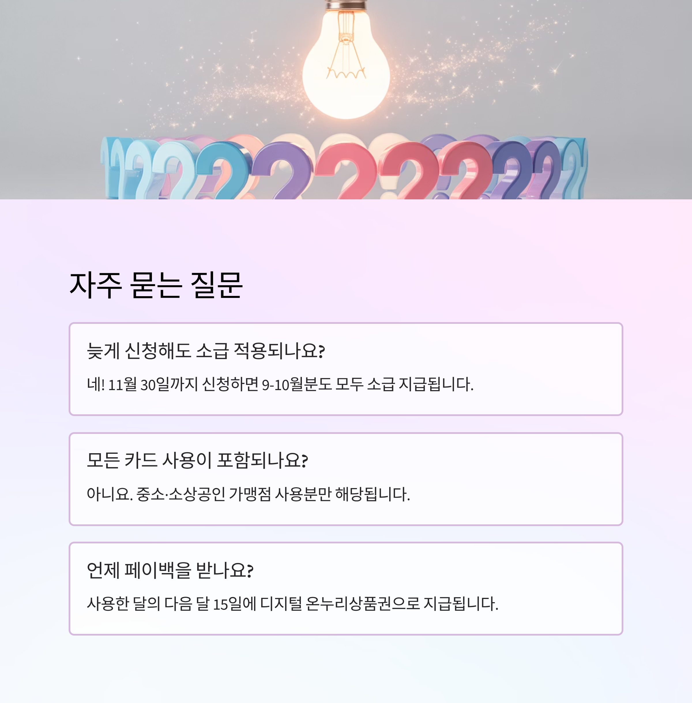 A1. 네, 가능합니다! 신청 기간인 11월 30일 안에만 신청하면, 9월과 10월의 소비 증가분도 모두 계산되어 한 번에 소급 지급됩니다. 그래도 잊어버리지 않게 미리미리 신청하는 게 좋겠죠?