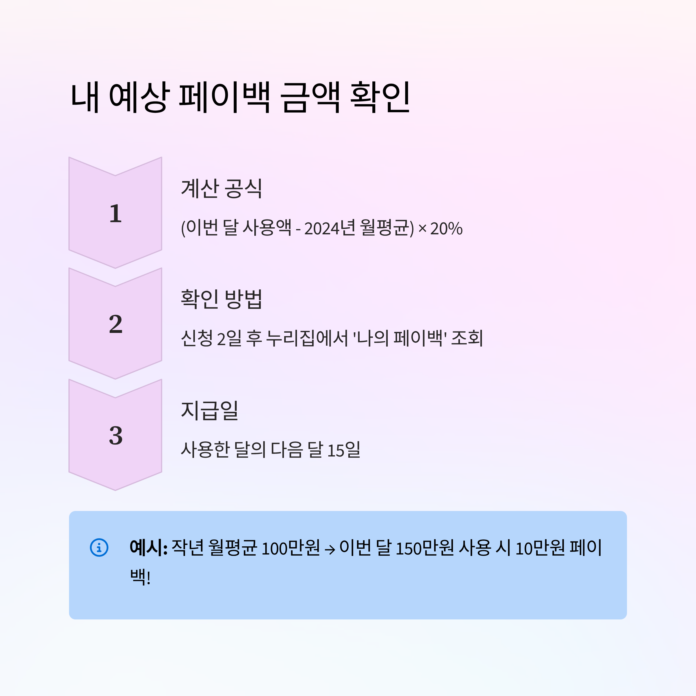 계산 공식 : (이번 달 카드 사용액 - 2024년 월평균 사용액) X 20% = 월 페이백 금액 (최대 10만원)